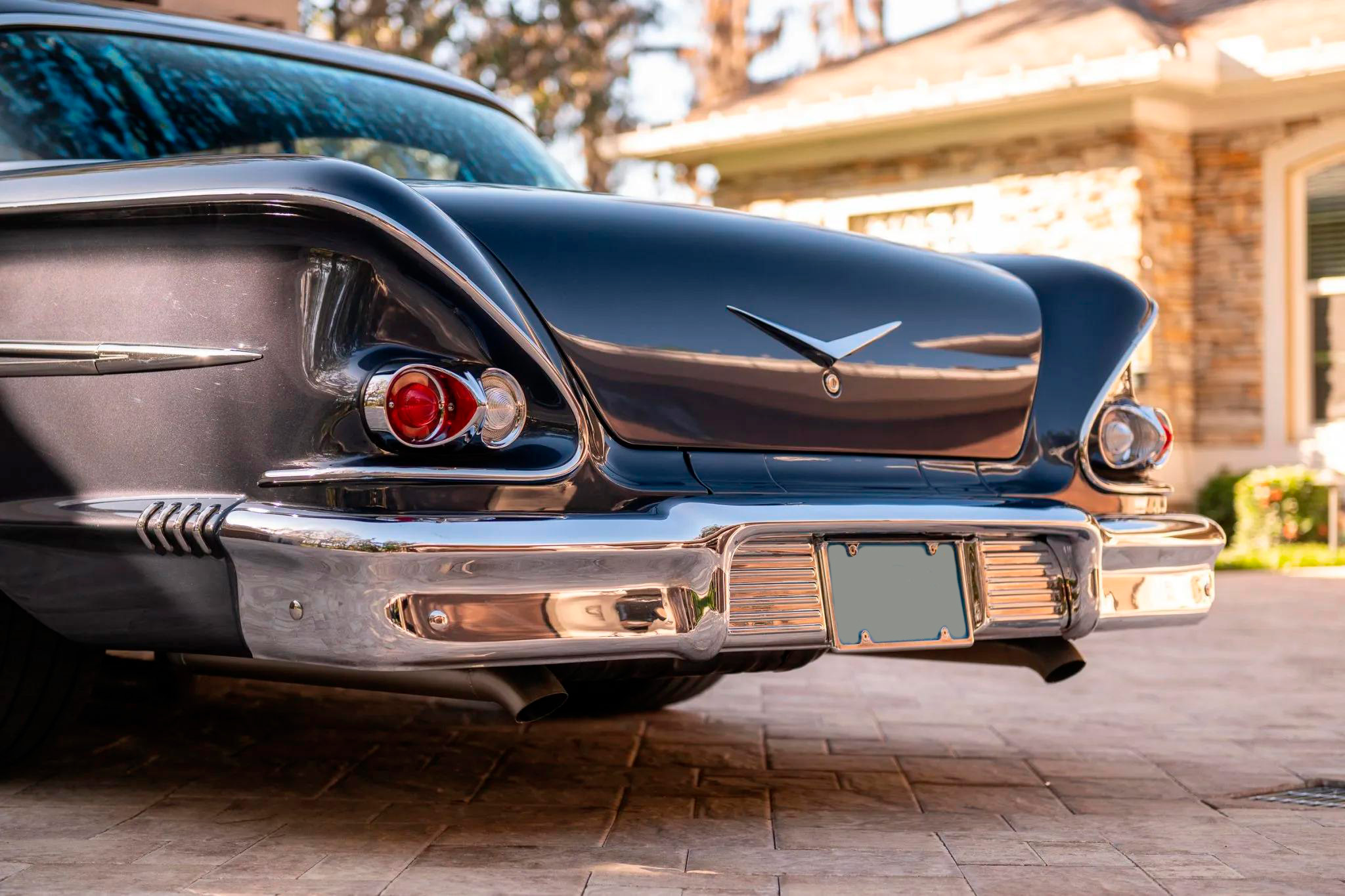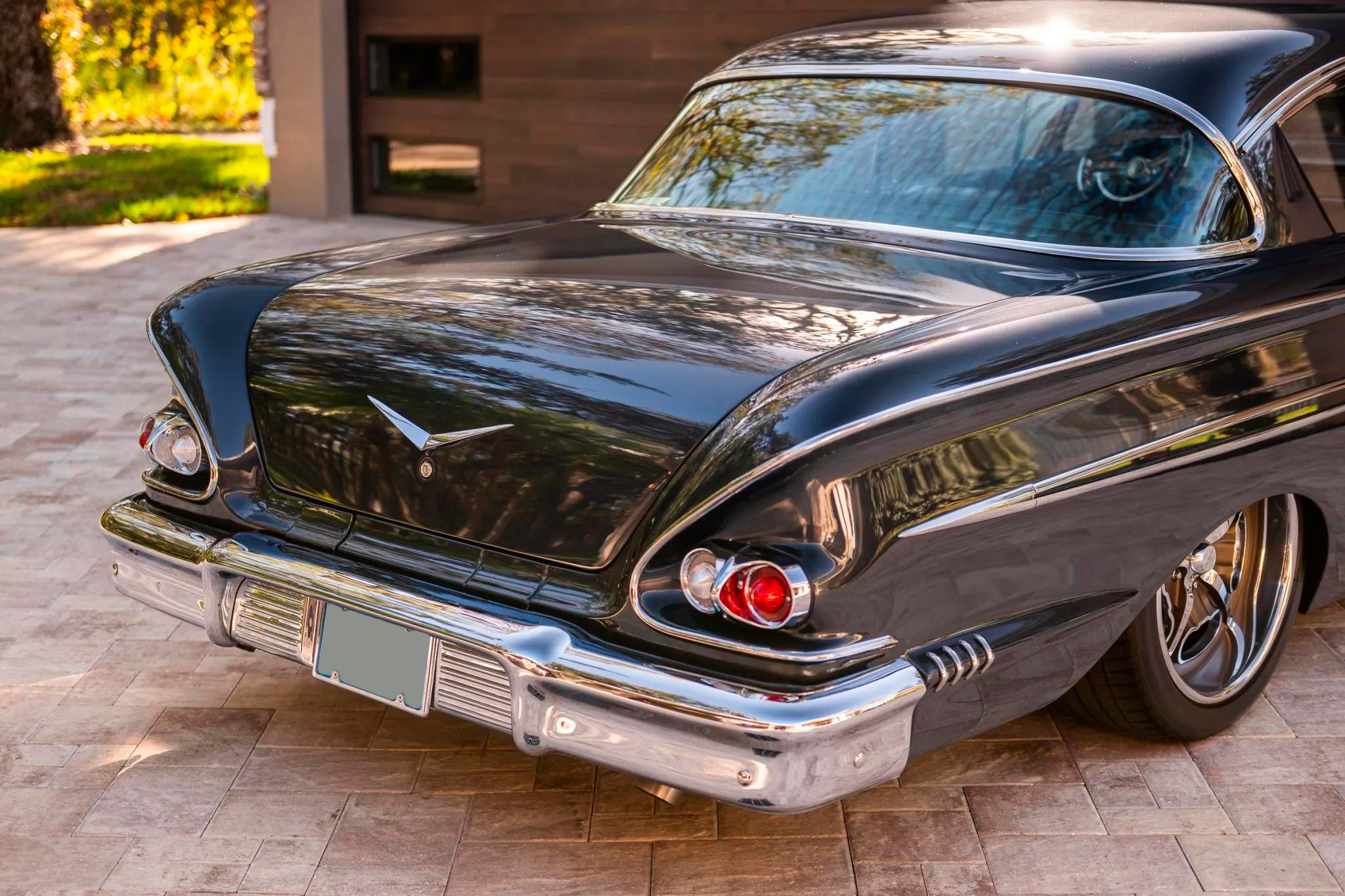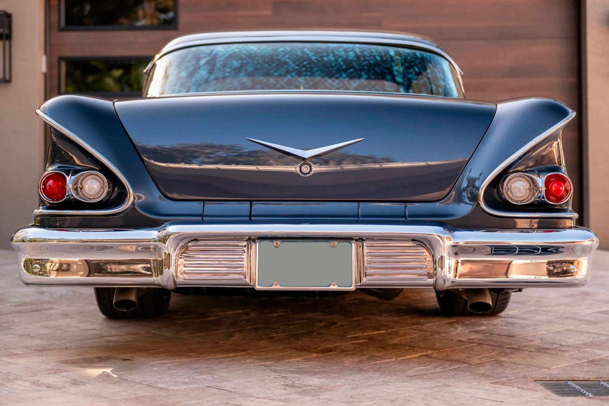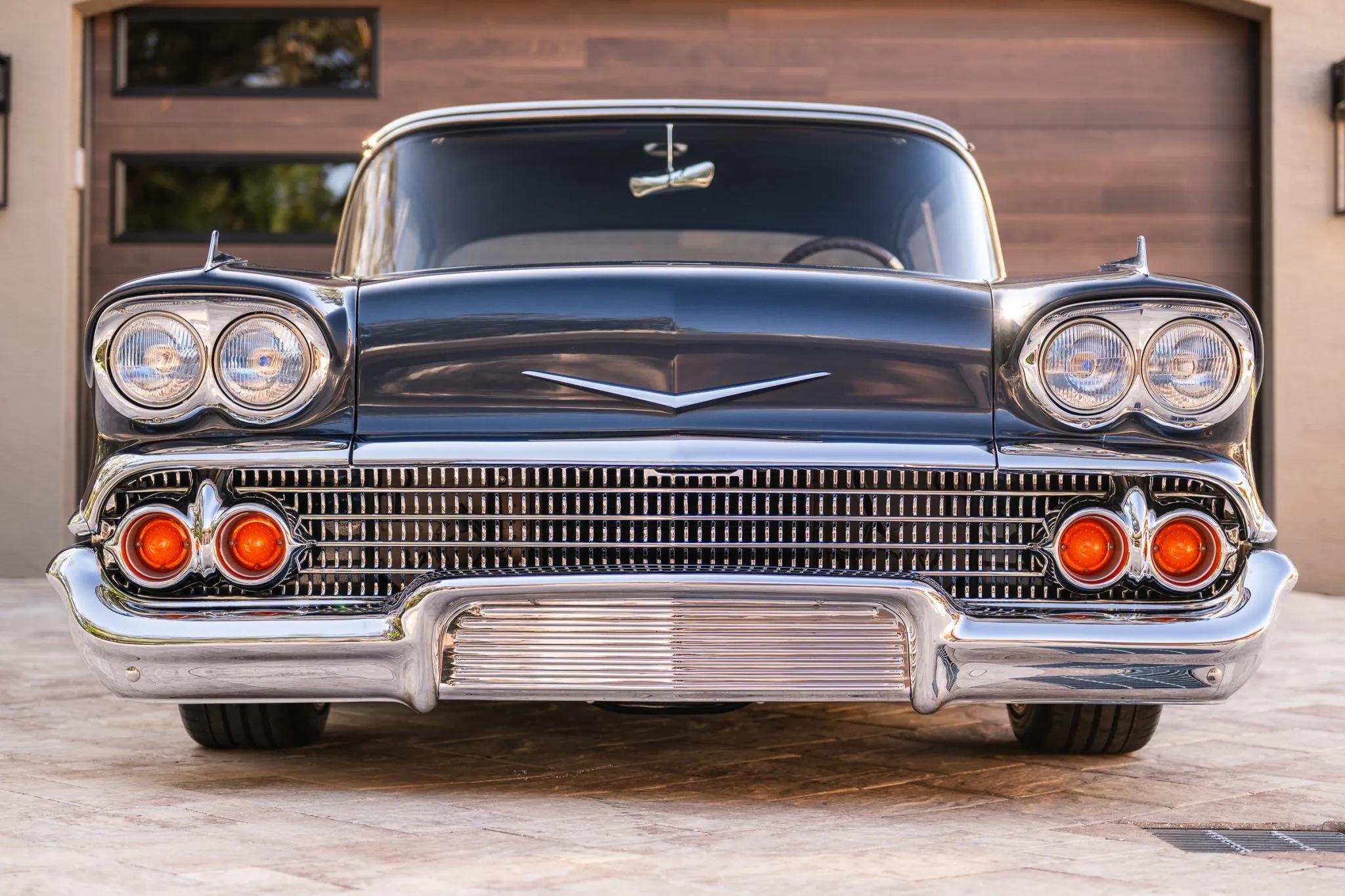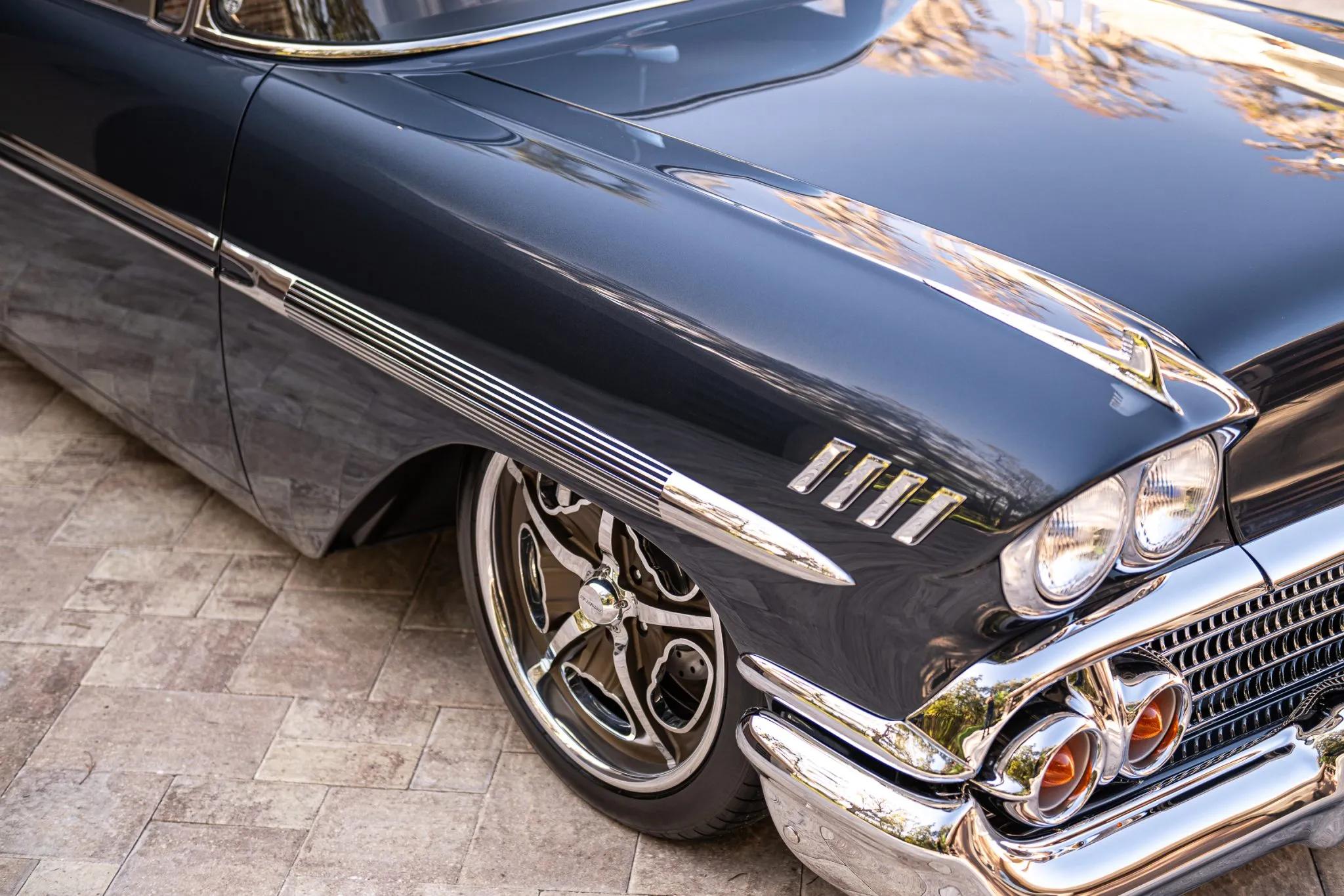 This 1958 Chevrolet Bel Air hardtop was built with a 572ci GM Performance V8 paired with a Tremec TKO-600 five-speed manual transmission and a Currie 9-inch rear end. The steel body is finished in metallic dark blue with refinished brightwork and rides on Schott Octane forged billet wheels measuring 19�8 inches front and 20�10 inches rear, mounted with Michelin Pilot Sport tires. The chassis features a Ridetech air suspension with a splined front sway bar and Wilwood four-wheel disc brakes with drilled and slotted rotors.