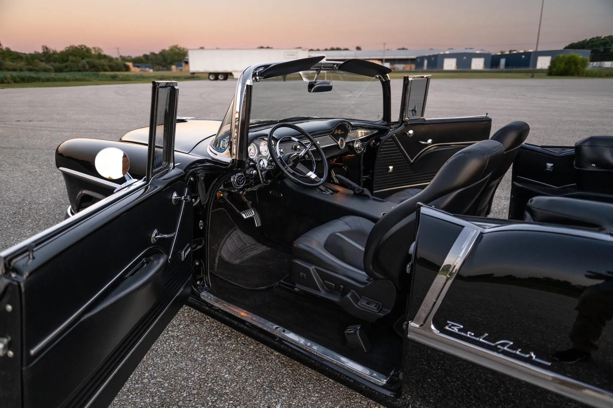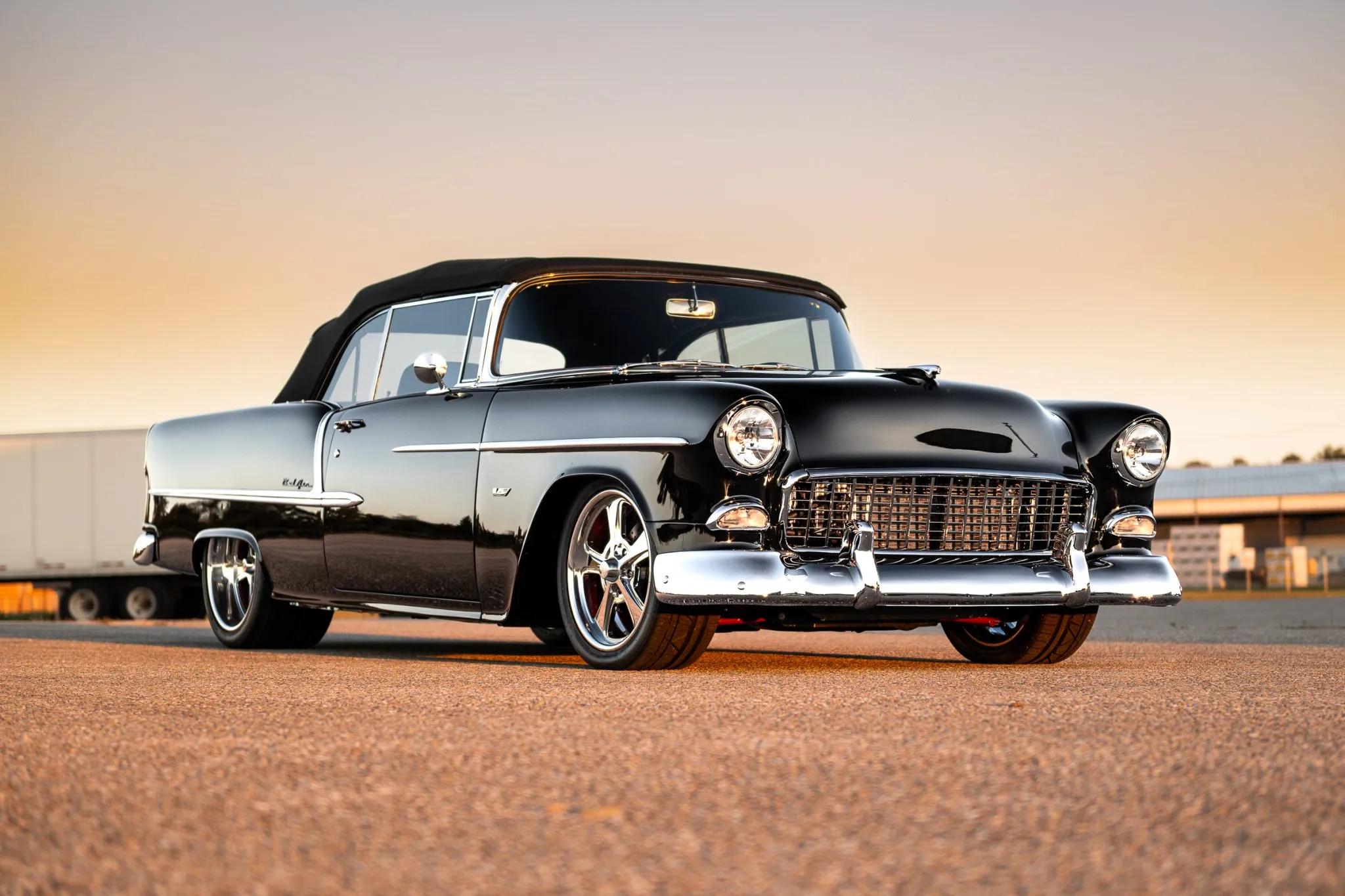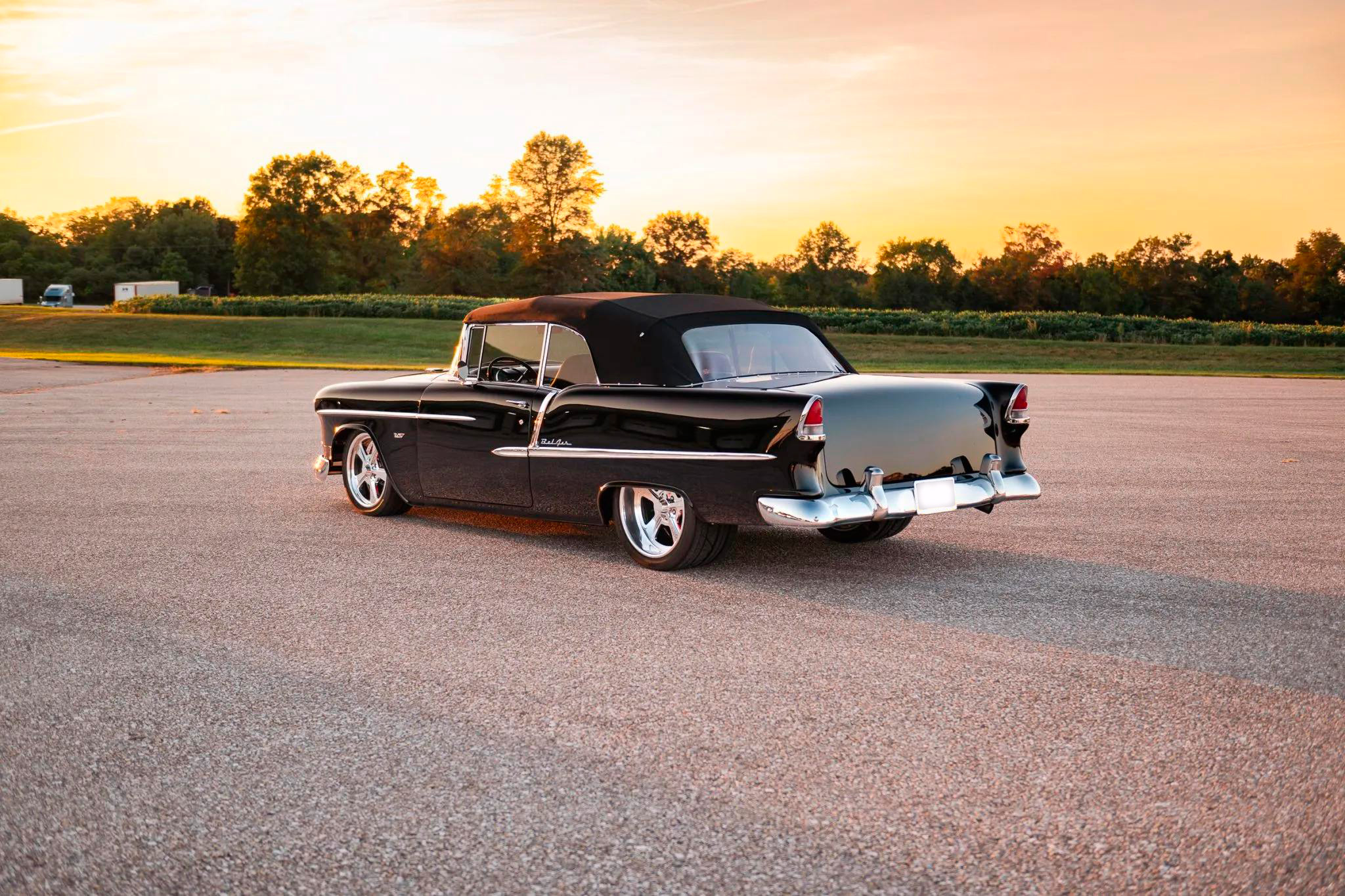 This 1955 Chevrolet Bel Air convertible is powered by a supercharged 6.2-liter LSA V8 paired with a 6L90 six-speed automatic transmission and a 9-inch rear end with a Positraction differential and 3.25:1 gearing. The car is finished in black with a power-operated black soft top, LED taillights, and Cadillac V badging.