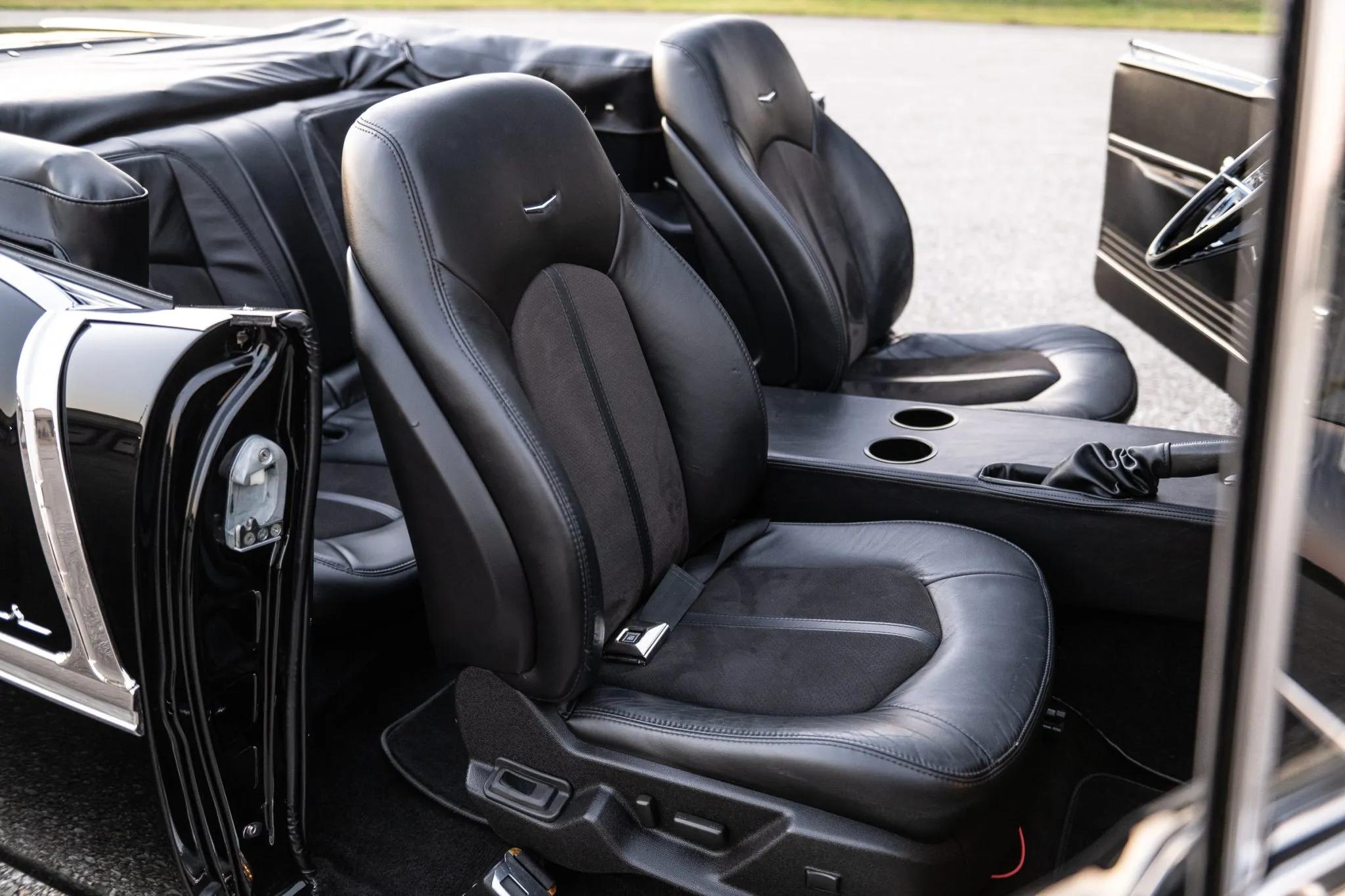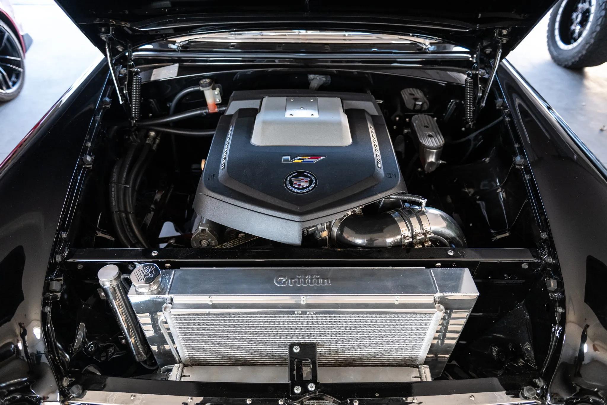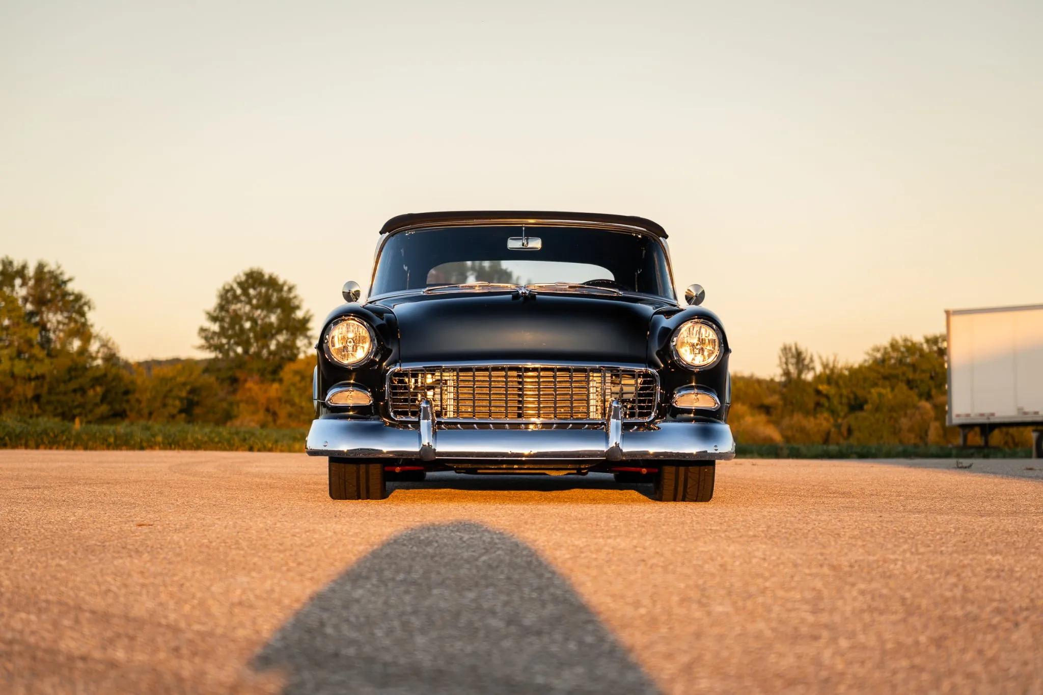 This 1955 Chevrolet Bel Air convertible is powered by a supercharged 6.2-liter LSA V8 paired with a 6L90 six-speed automatic transmission and a 9-inch rear end with a Positraction differential and 3.25:1 gearing. The car is finished in black with a power-operated black soft top, LED taillights, and Cadillac V badging.