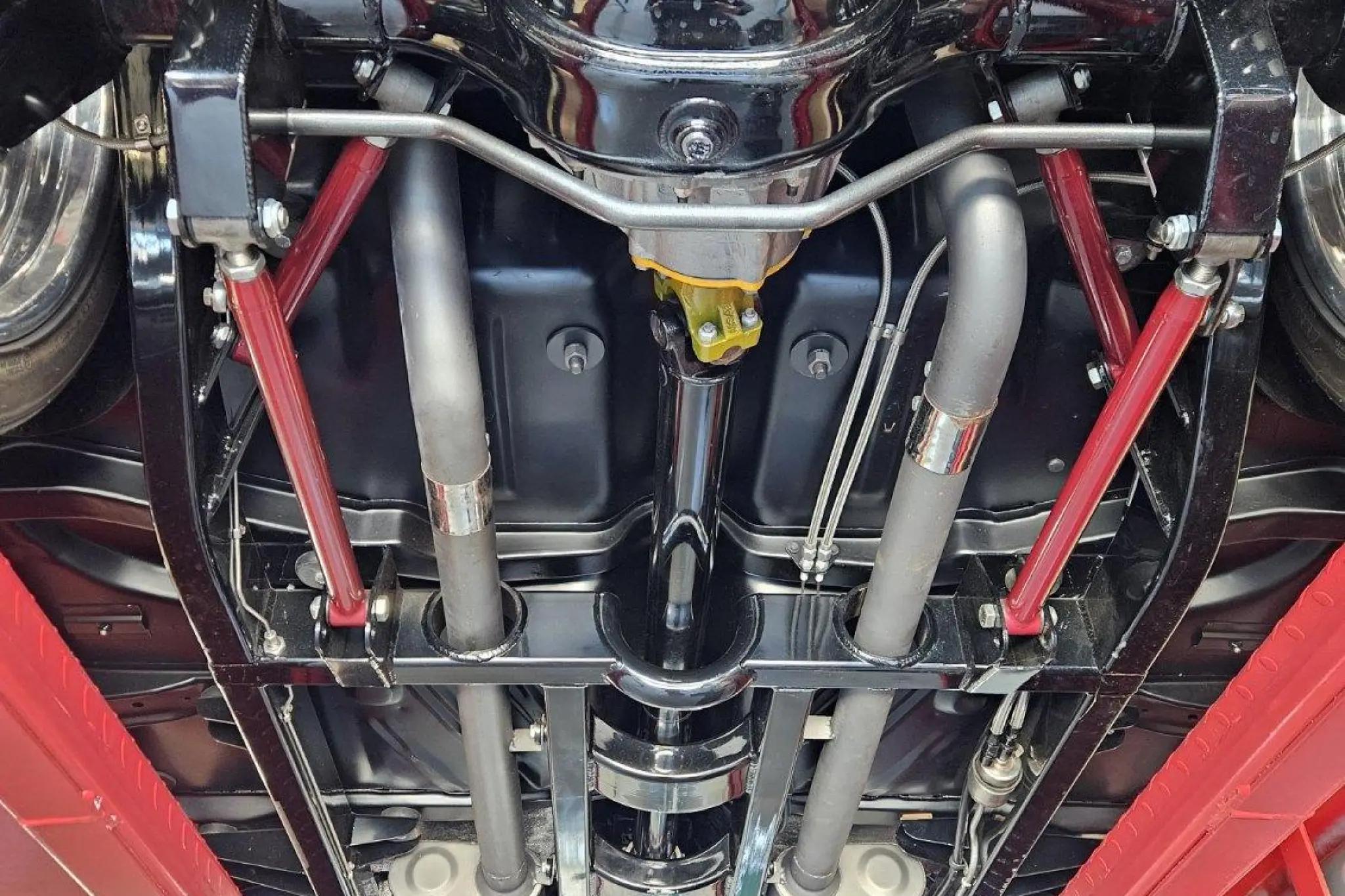 The supercharged 6.2-liter LSA V8 features a Griffin aluminum radiator, stainless Rock Valley fuel tank, red-coated headers, aftermarket ECU, and Street Performance wiring harnesses. Power is routed through the automatic transmission to the rear wheels via a dual exhaust system. The odometer shows under 1,200 miles since completion.
