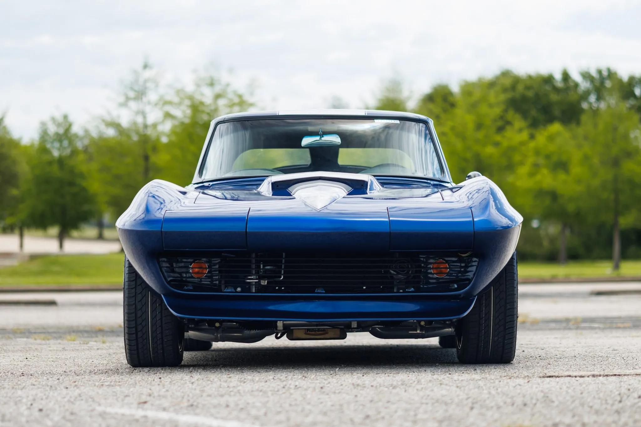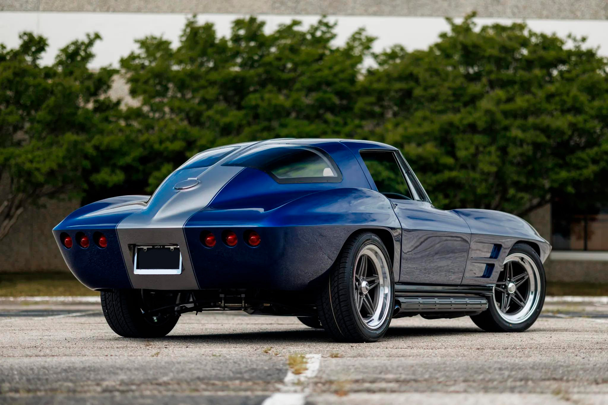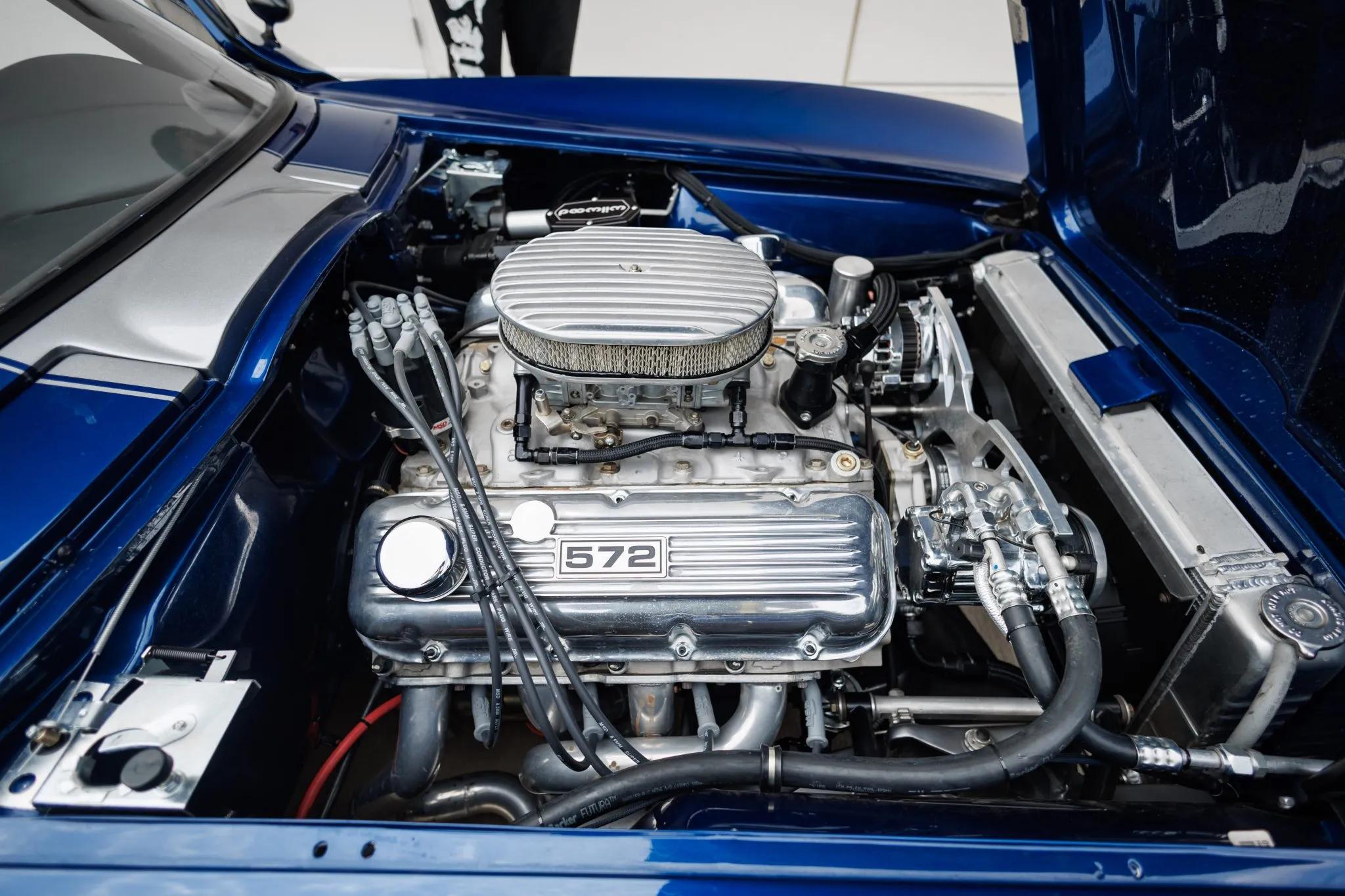 This 1963 Chevrolet Corvette split-window coupe is finished in metallic blue with a silver center stripe and is powered by a 572ci V8 paired with a Tremec five-speed manual transmission and a rear end with 4.11:1 gears. The build includes a C4 Corvette-style chassis with coilovers, power steering, and four-wheel Baer disc brakes with a Wilwood master cylinder.