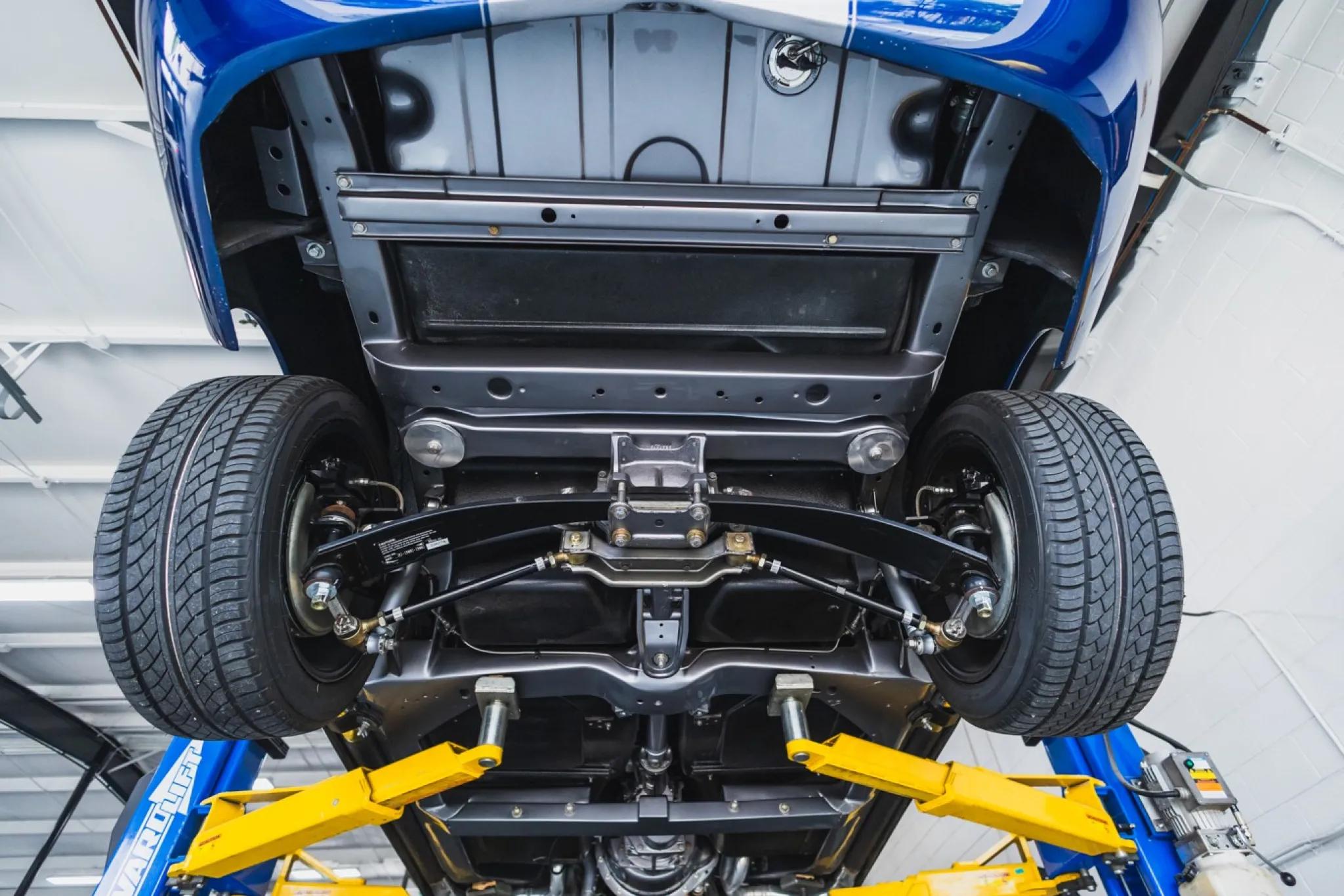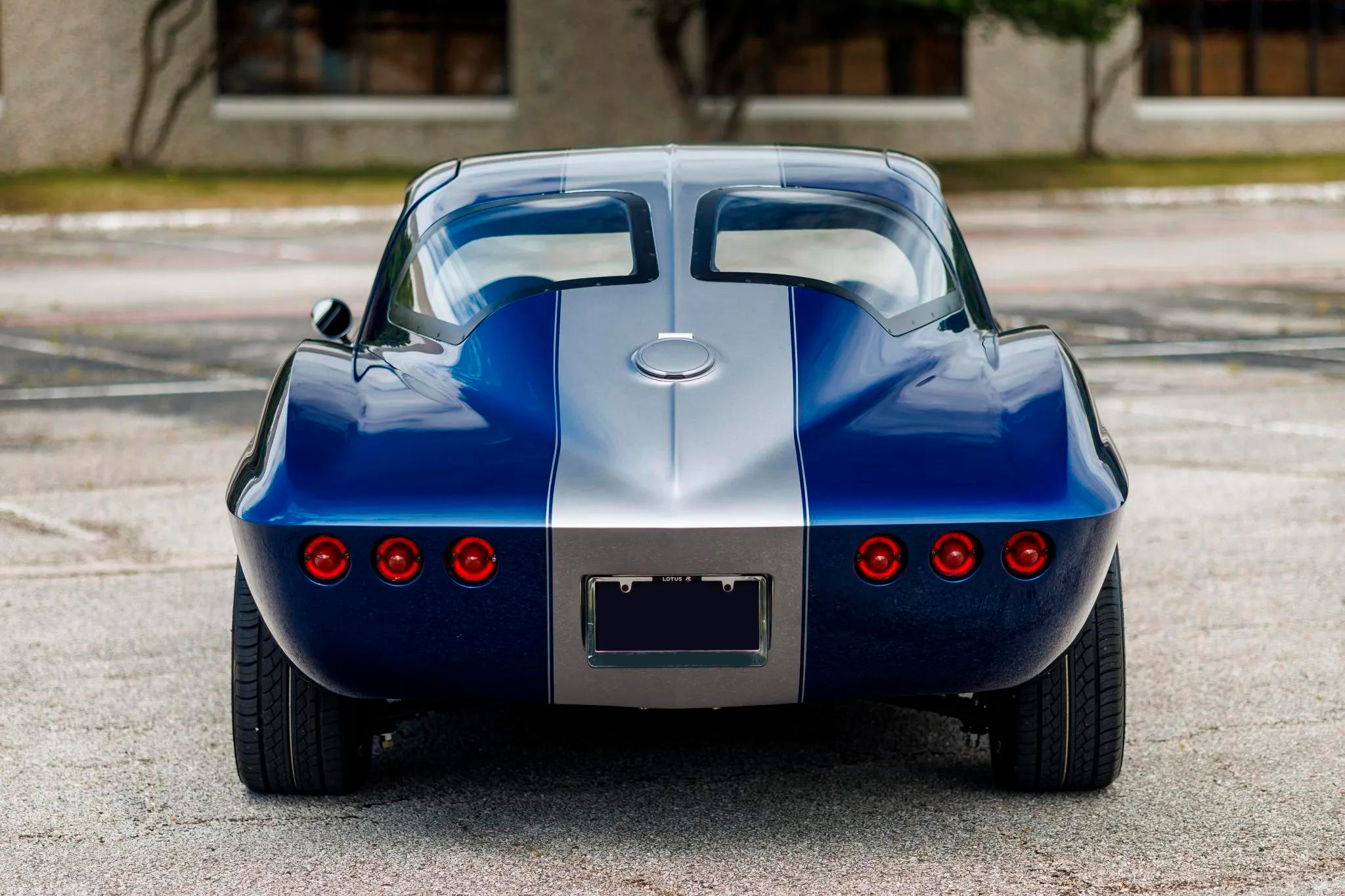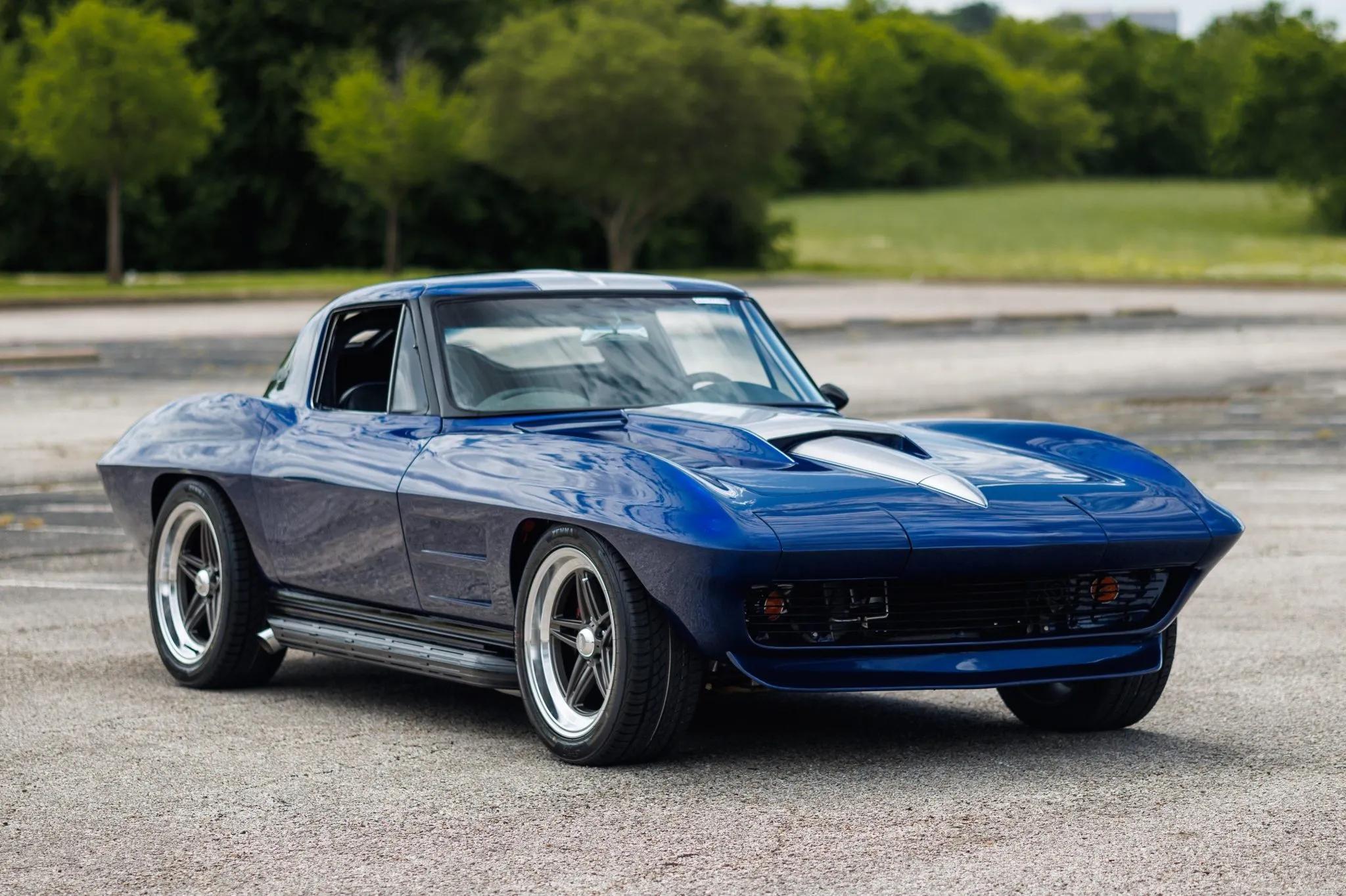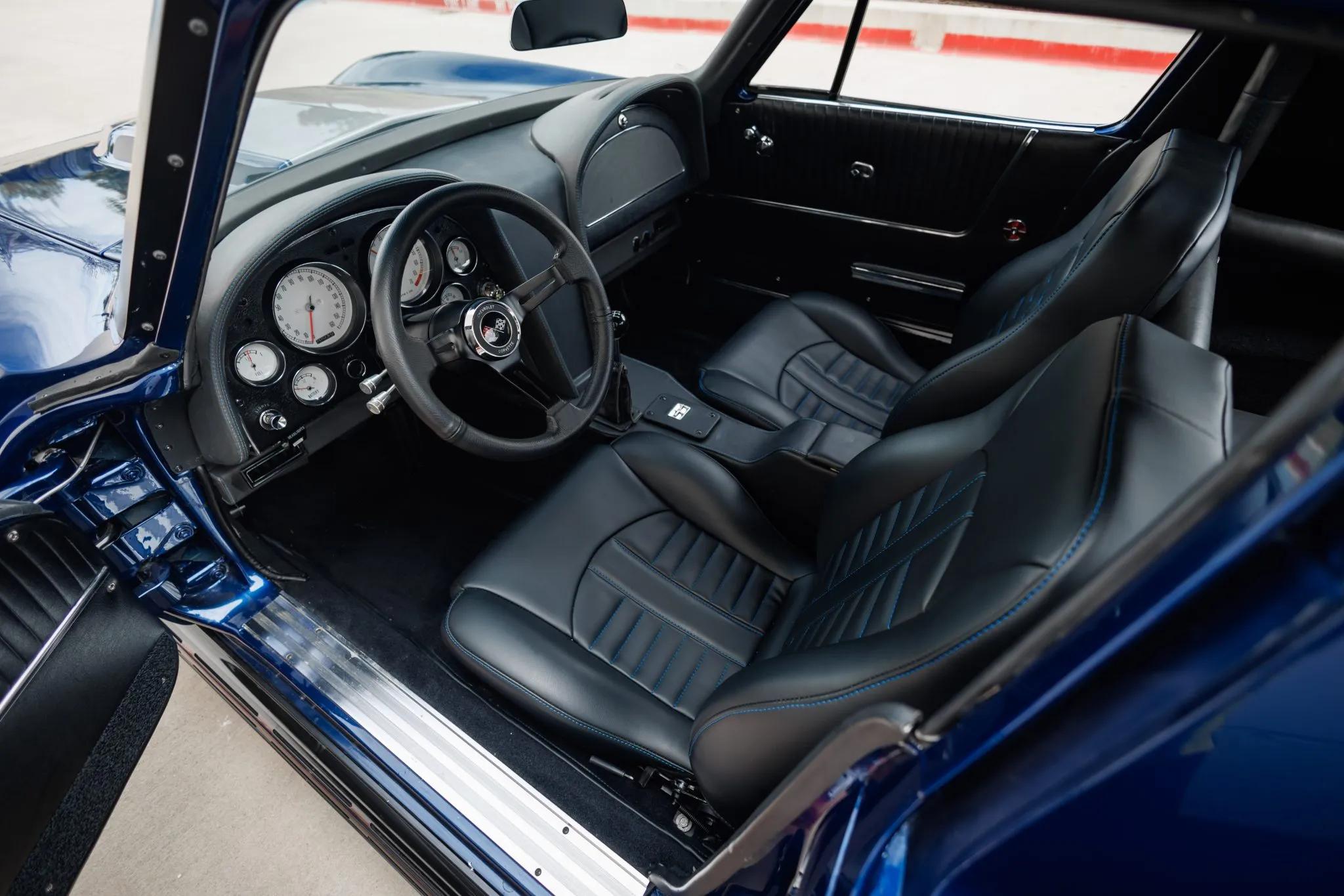 This 1963 Chevrolet Corvette split-window coupe is finished in metallic blue with a silver center stripe and is powered by a 572ci V8 paired with a Tremec five-speed manual transmission and a rear end with 4.11:1 gears. The build includes a C4 Corvette-style chassis with coilovers, power steering, and four-wheel Baer disc brakes with a Wilwood master cylinder.