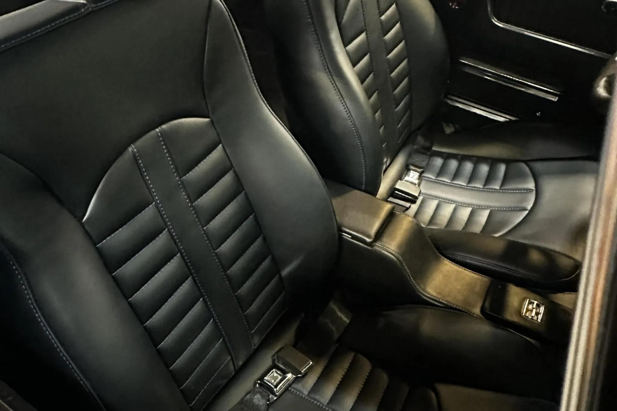 The interior includes low-back bucket seats trimmed in black leather with blue stitching, a padded roll bar, air conditioning, and power windows. White-dial gauges include a 160-mph speedometer, a 7k-rpm tachometer, and auxiliary readouts.
