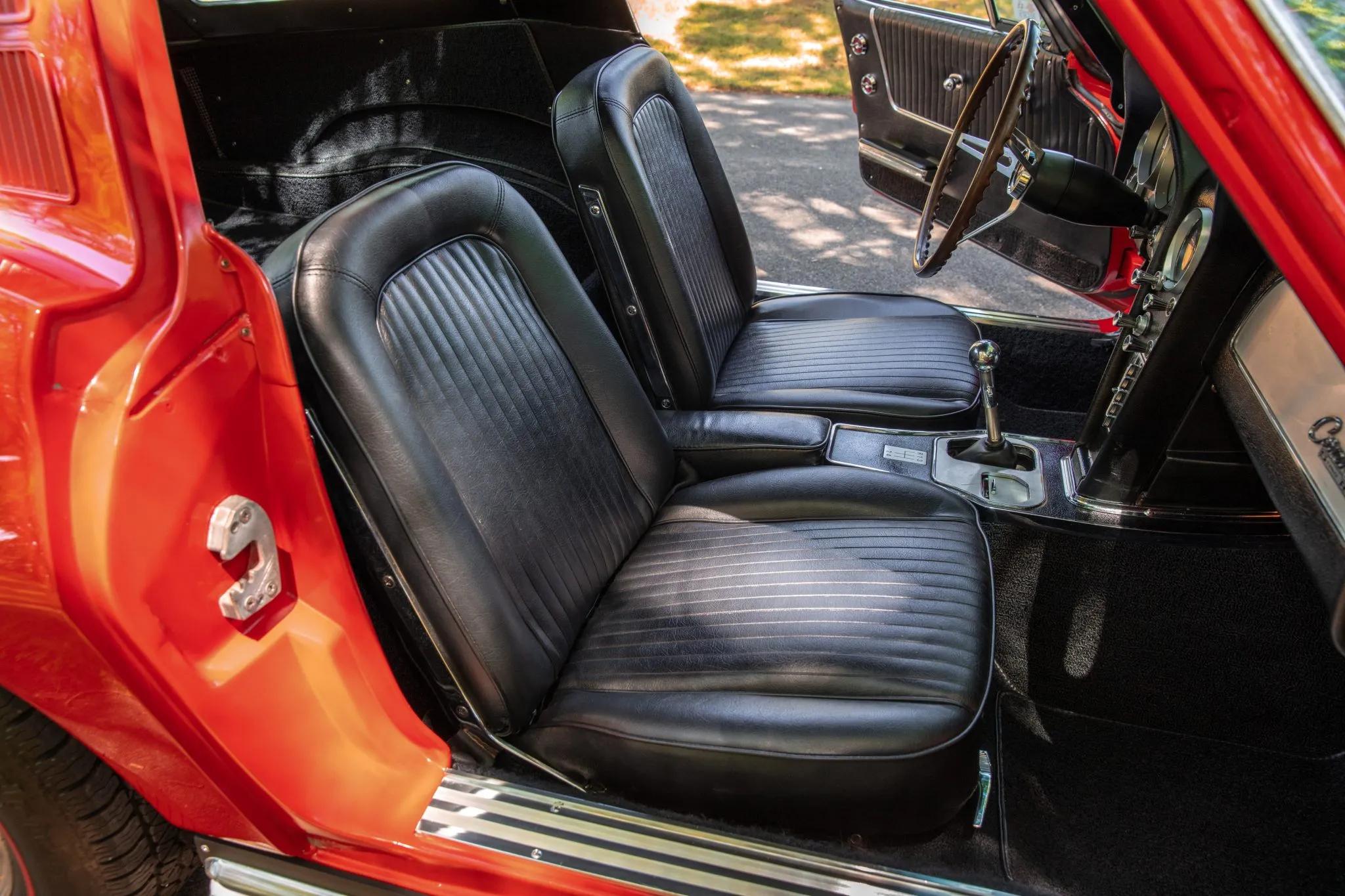The interior was refreshed with new seat covers, foam, carpeting, and weatherstripping. Equipment includes a heater, AM/FM radio, analog clock, and lap belts. The three-spoke steering wheel fronts refurbished factory gauges, including a 160-mph speedometer, a tachometer, and auxiliary readouts. The odometer shows 75k miles, with about 40 added under current ownership.