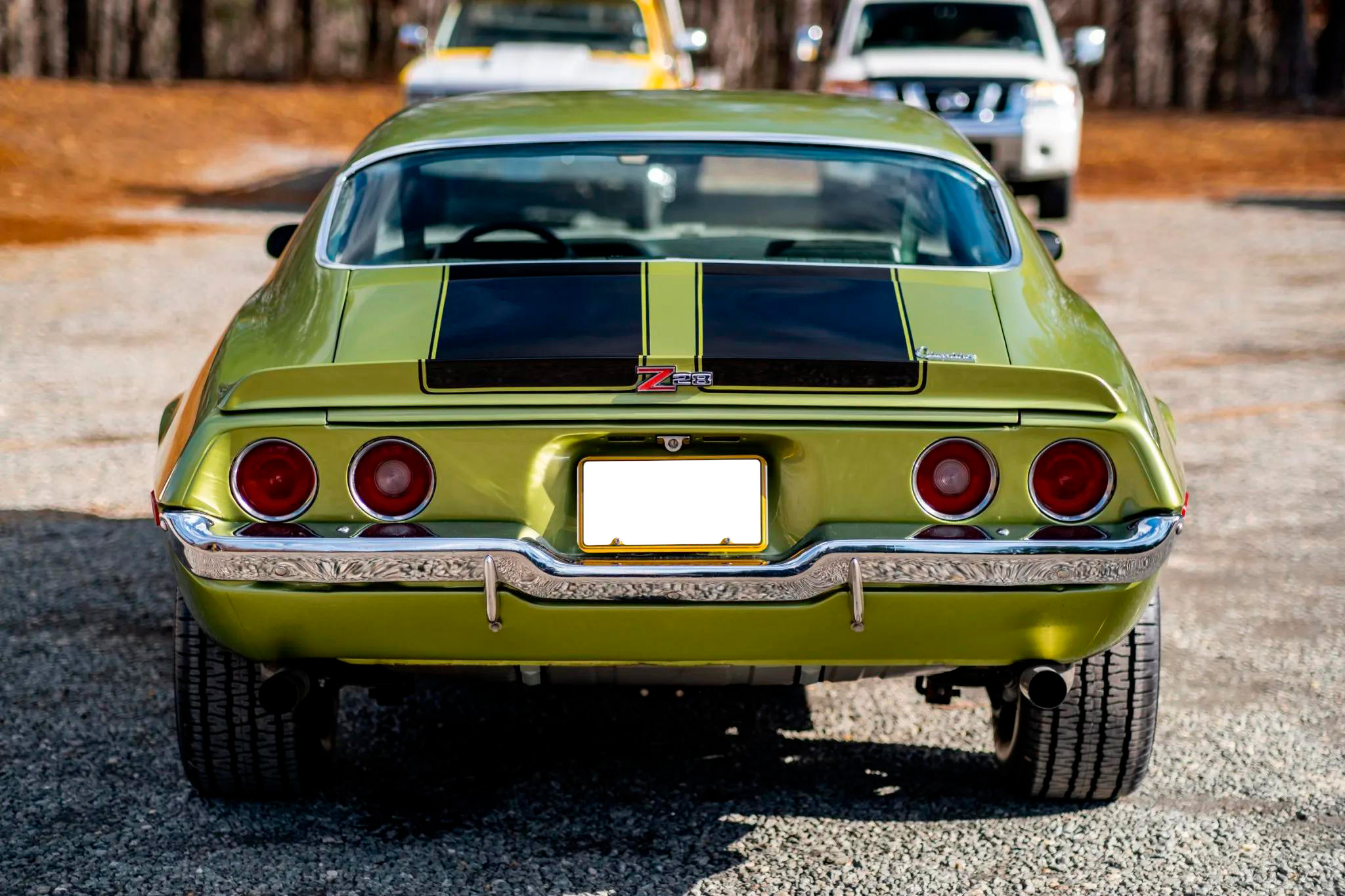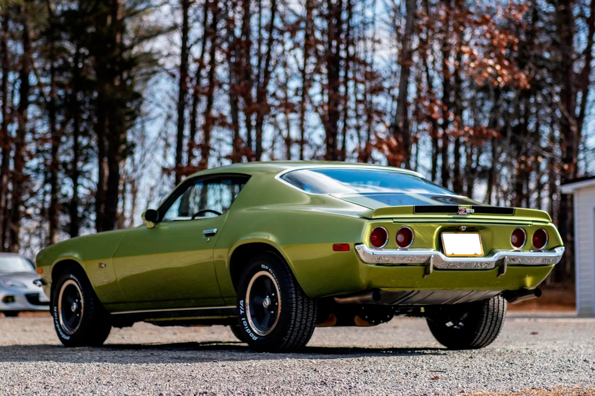 Factory-style 15-inch Z28 steel wheels with gray centers and polished trim rings wear BFGoodrich Radial T/A white-letter tires. The car features front and rear lip spoilers, chrome bumpers, Z28 badging, and a blacked-out grille. Braking is handled by four-wheel discs.