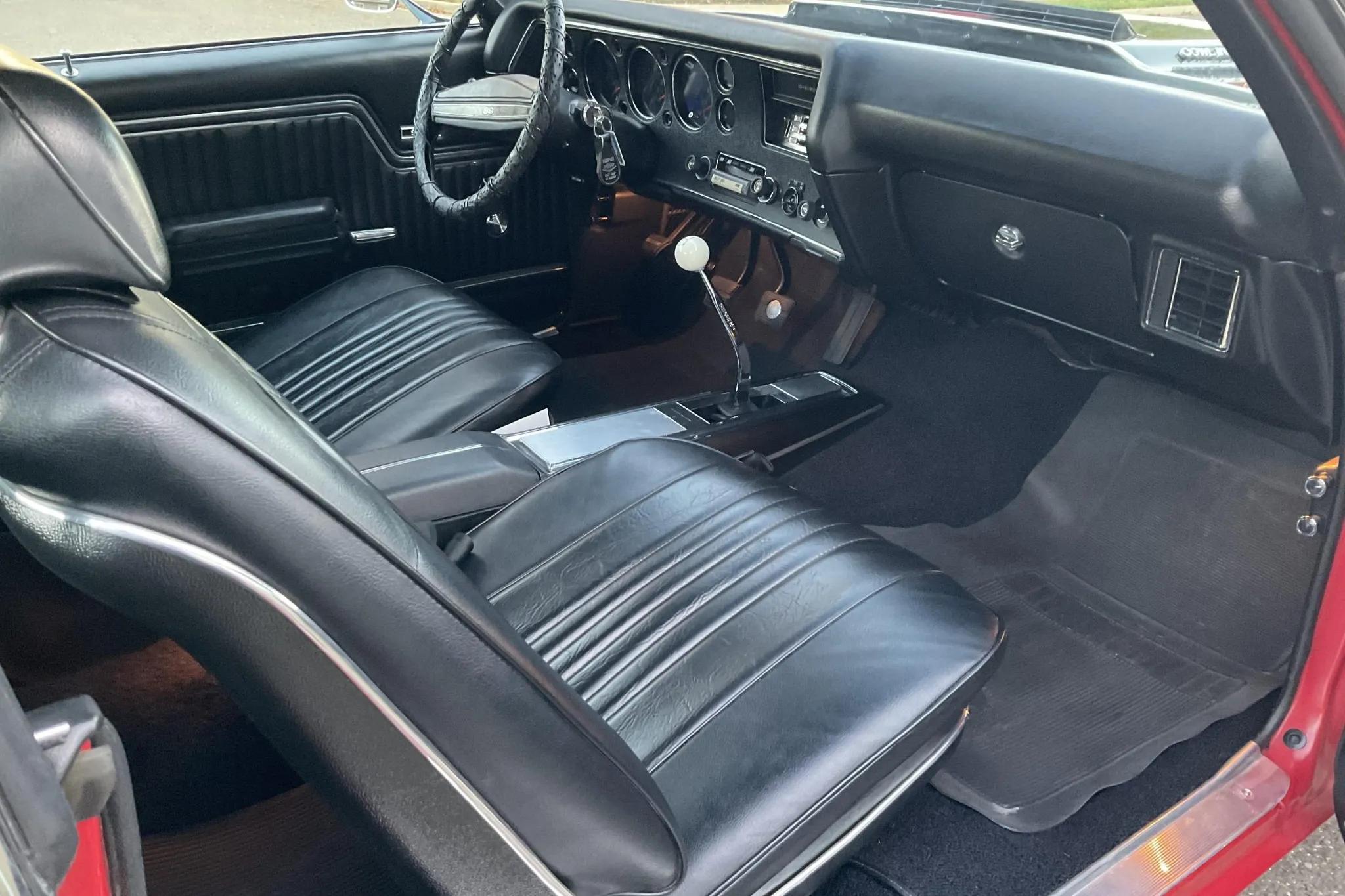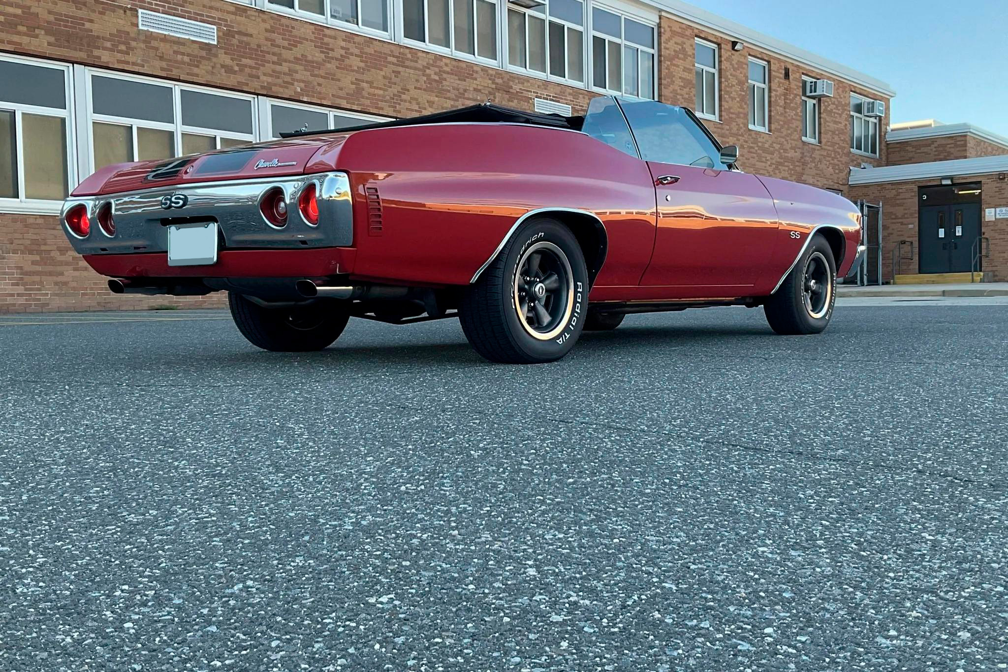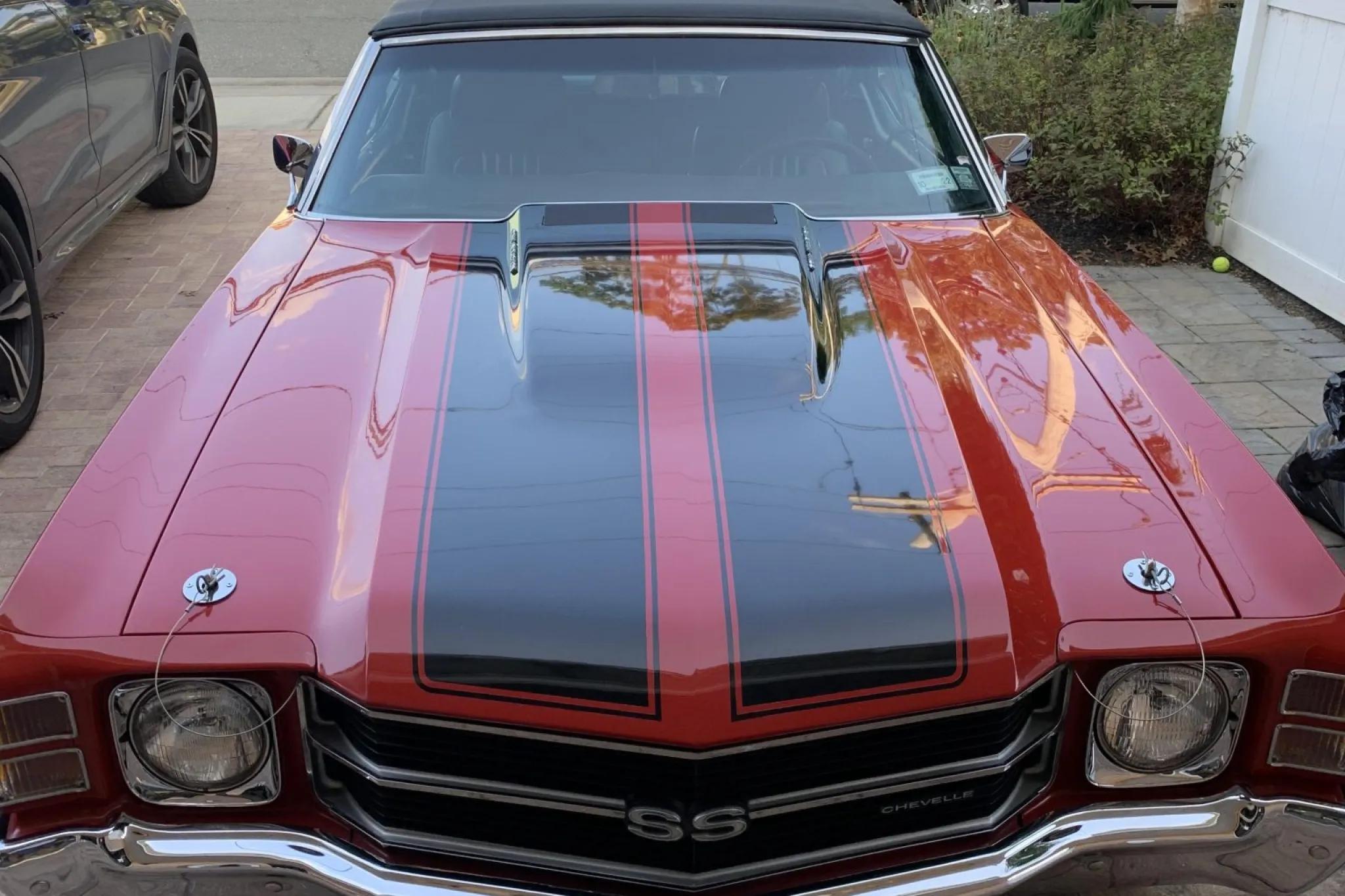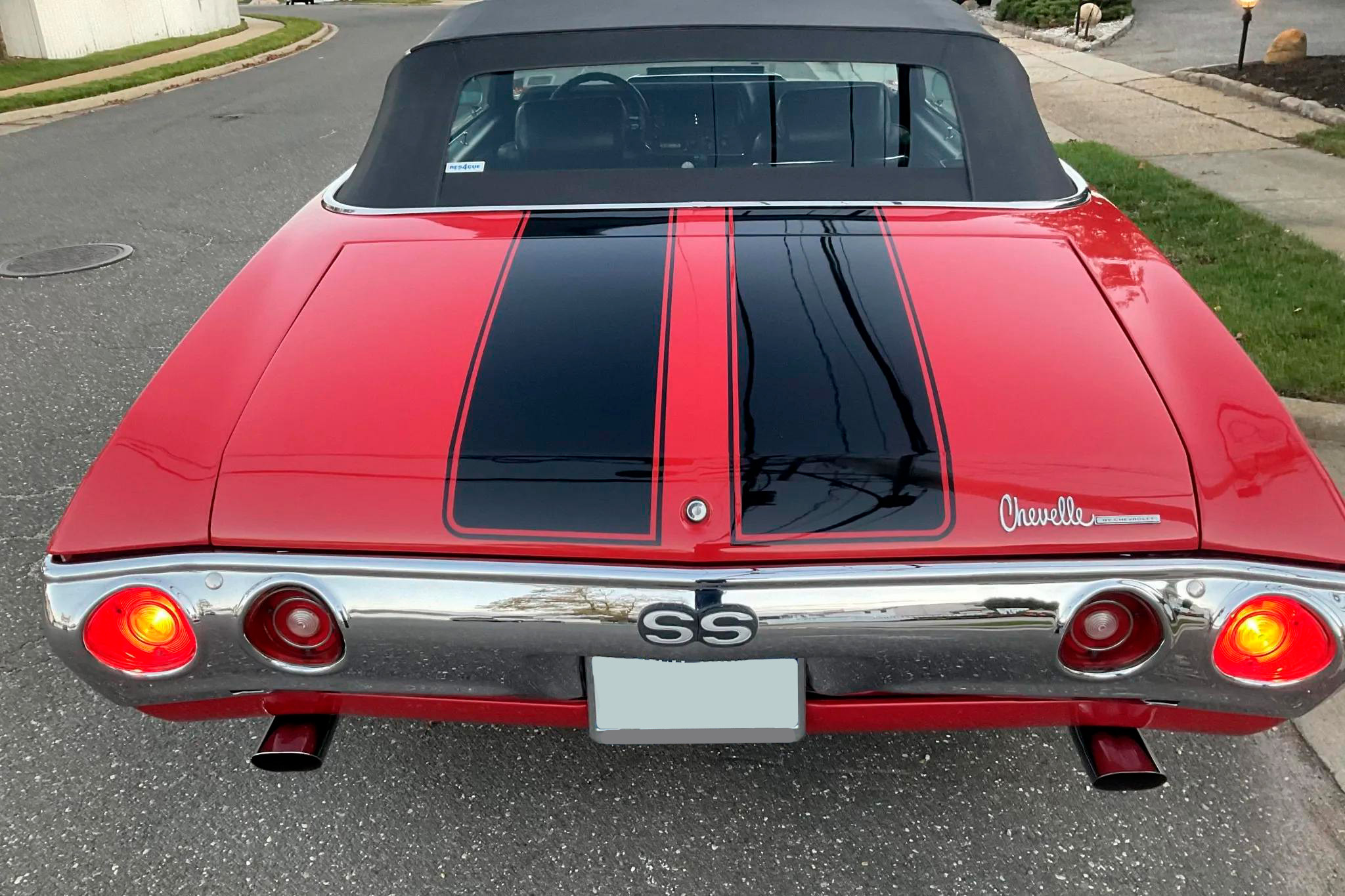 This 1971 Chevrolet Chevelle convertible is finished in red with black stripes over black vinyl upholstery and is powered by a replacement 402ci V8 paired with a four-speed manual transmission. The car is equipped with a black soft top, cowl induction hood with hood pins, chrome bumpers and trim, SS badging, dual exhaust outlets, power steering, and power-assisted front disc and rear drum brakes.