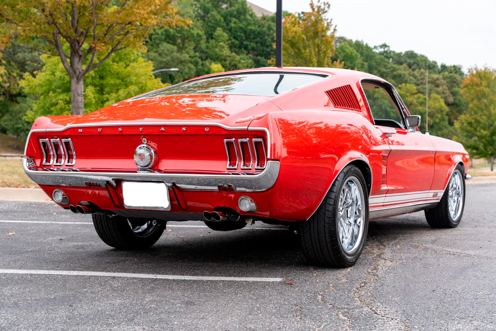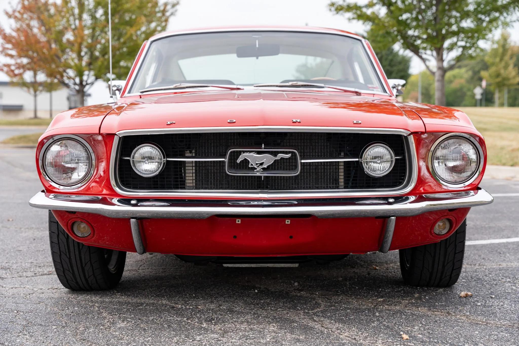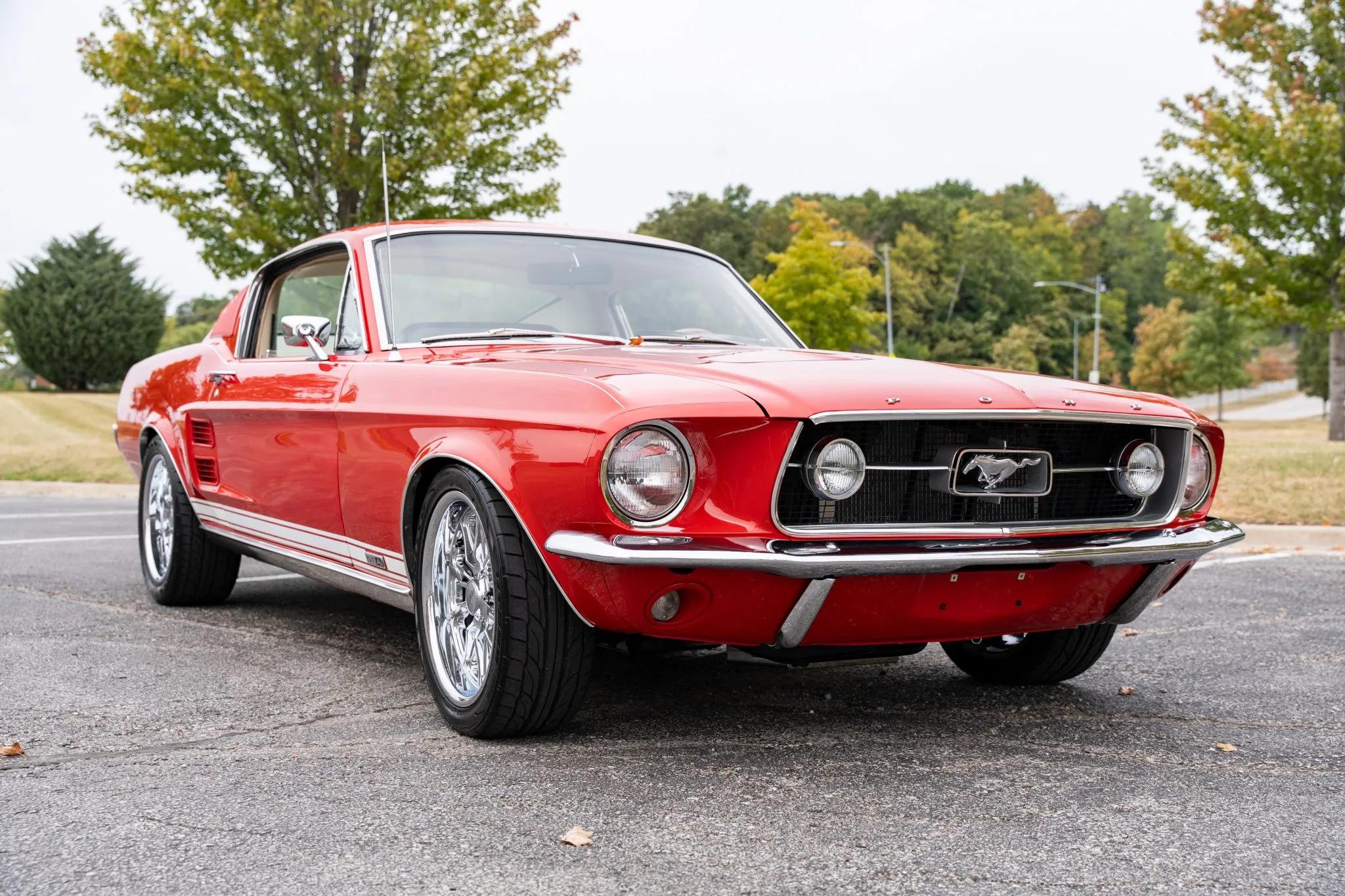 This 1967 Ford Mustang GT fastback was originally an S-code car with a 390ci V8, 3.25 limited-slip differential, Dark Moss Green exterior, and Parchment interior. It has since been overhauled and modified, now finished in red with white stripes and powered by a 390ci crate V8 with an Edelbrock intake manifold and Holley double-pumper carburetor. The engine is paired with a performance-built C6 automatic transmission and a 3.00 replacement differential.