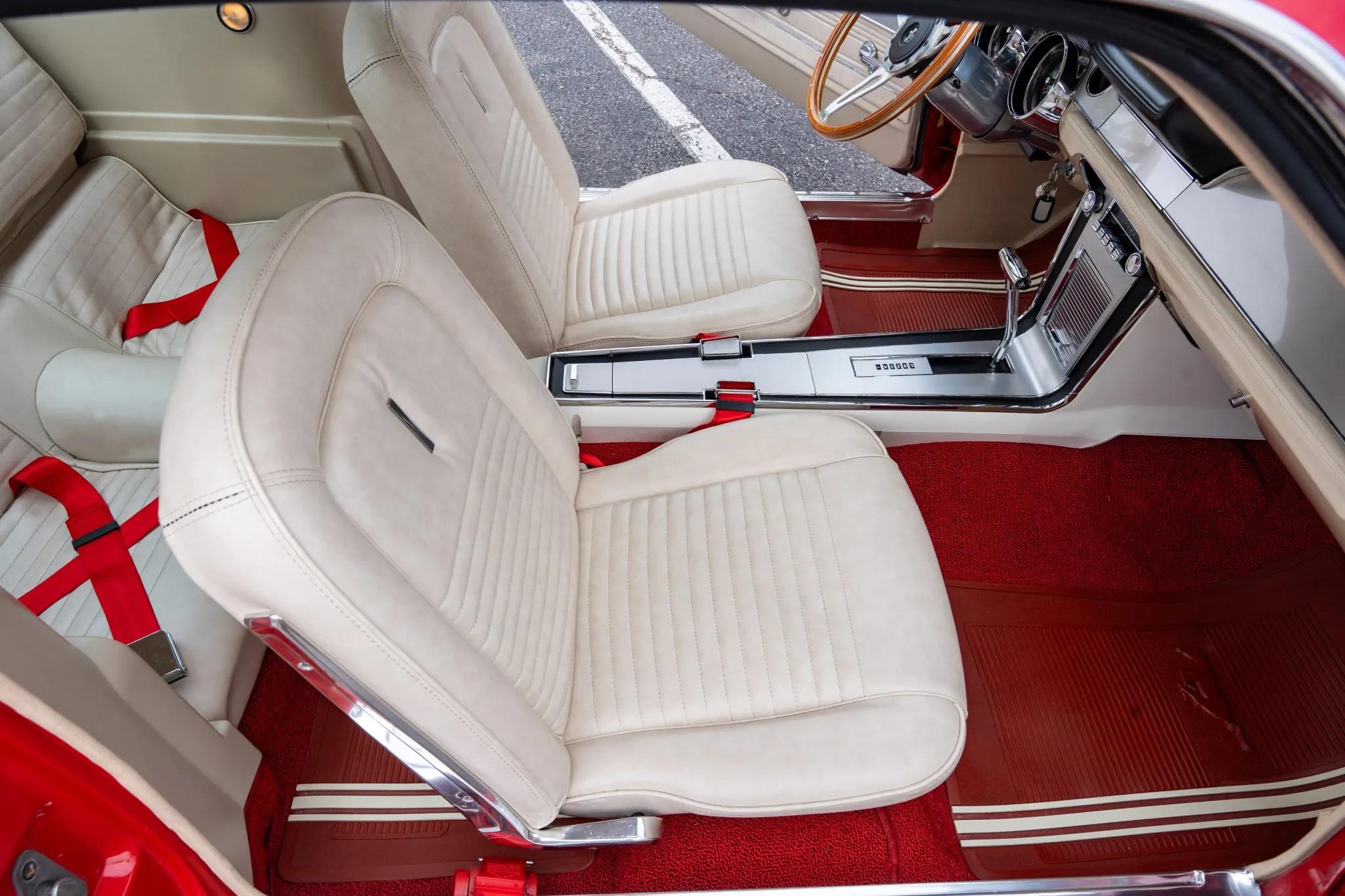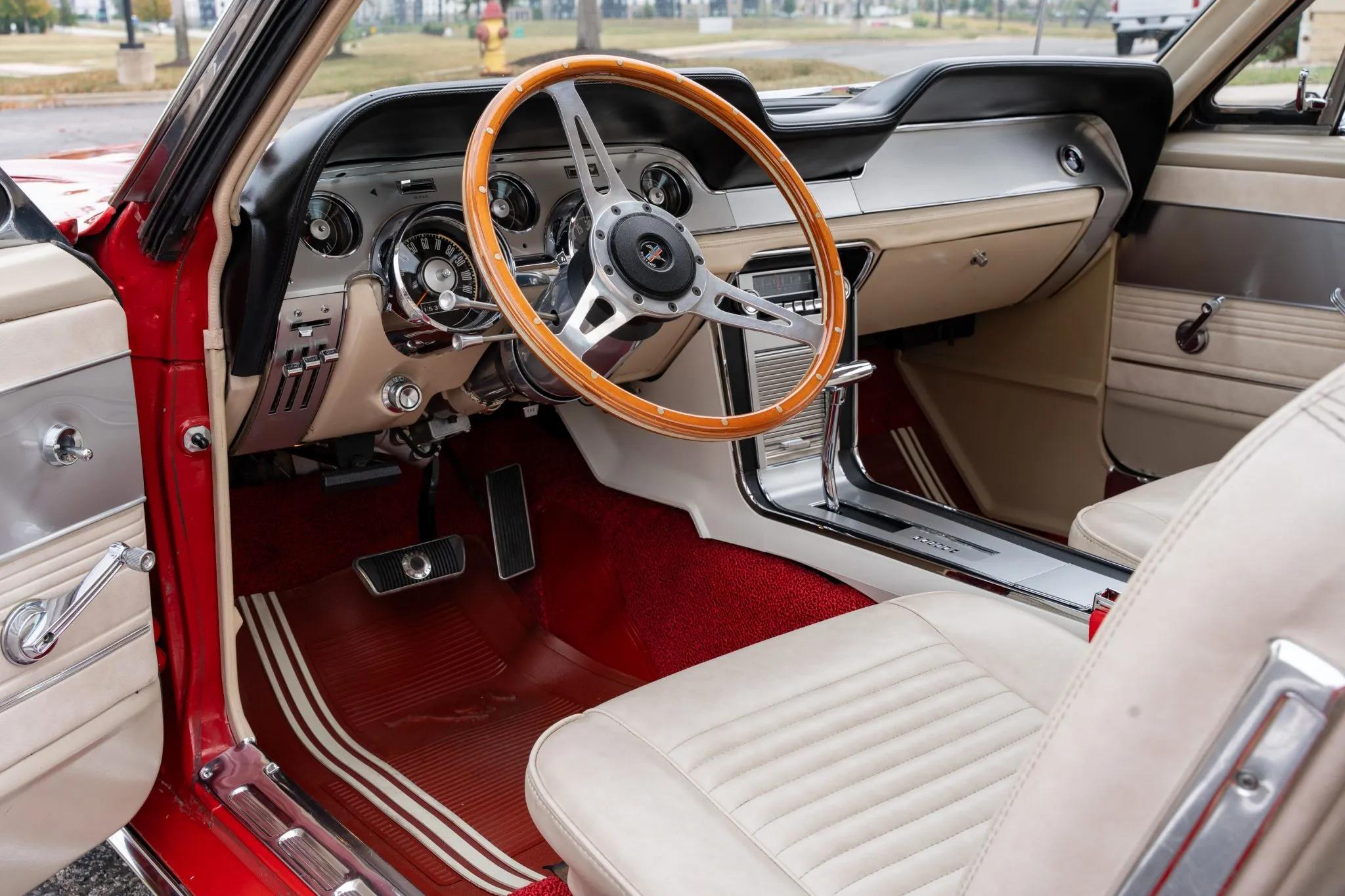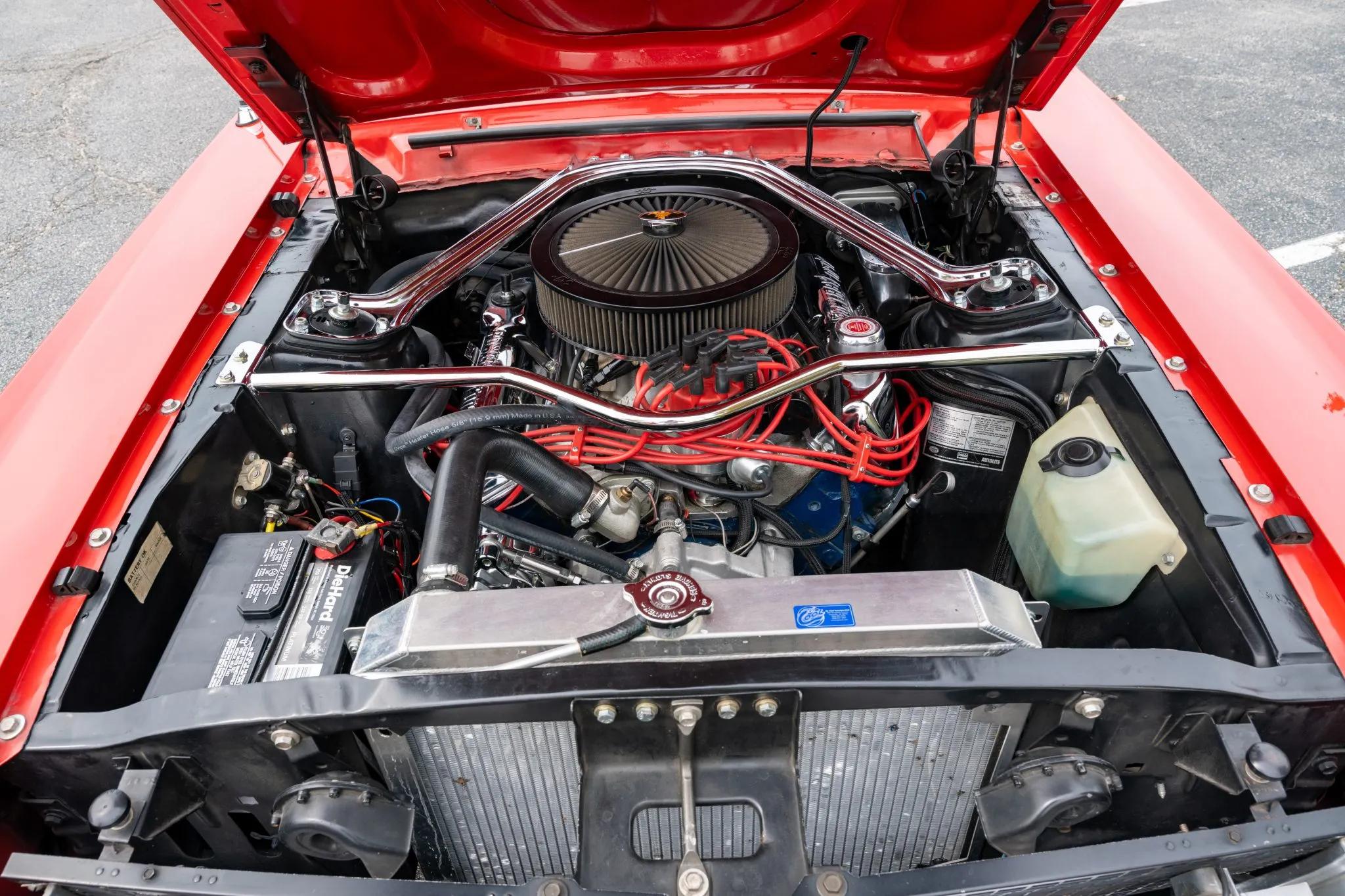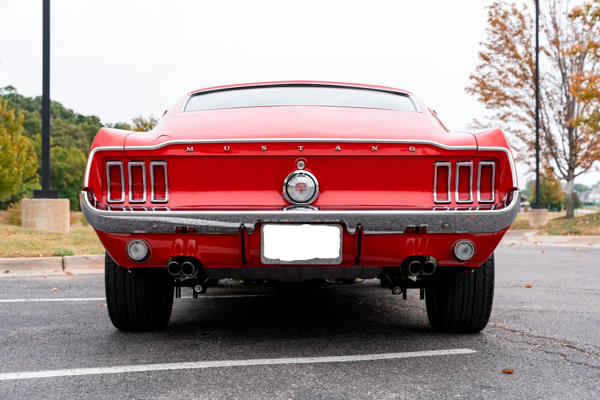This 1967 Ford Mustang GT fastback was originally an S-code car with a 390ci V8, 3.25 limited-slip differential, Dark Moss Green exterior, and Parchment interior. It has since been overhauled and modified, now finished in red with white stripes and powered by a 390ci crate V8 with an Edelbrock intake manifold and Holley double-pumper carburetor. The engine is paired with a performance-built C6 automatic transmission and a 3.00 replacement differential.
