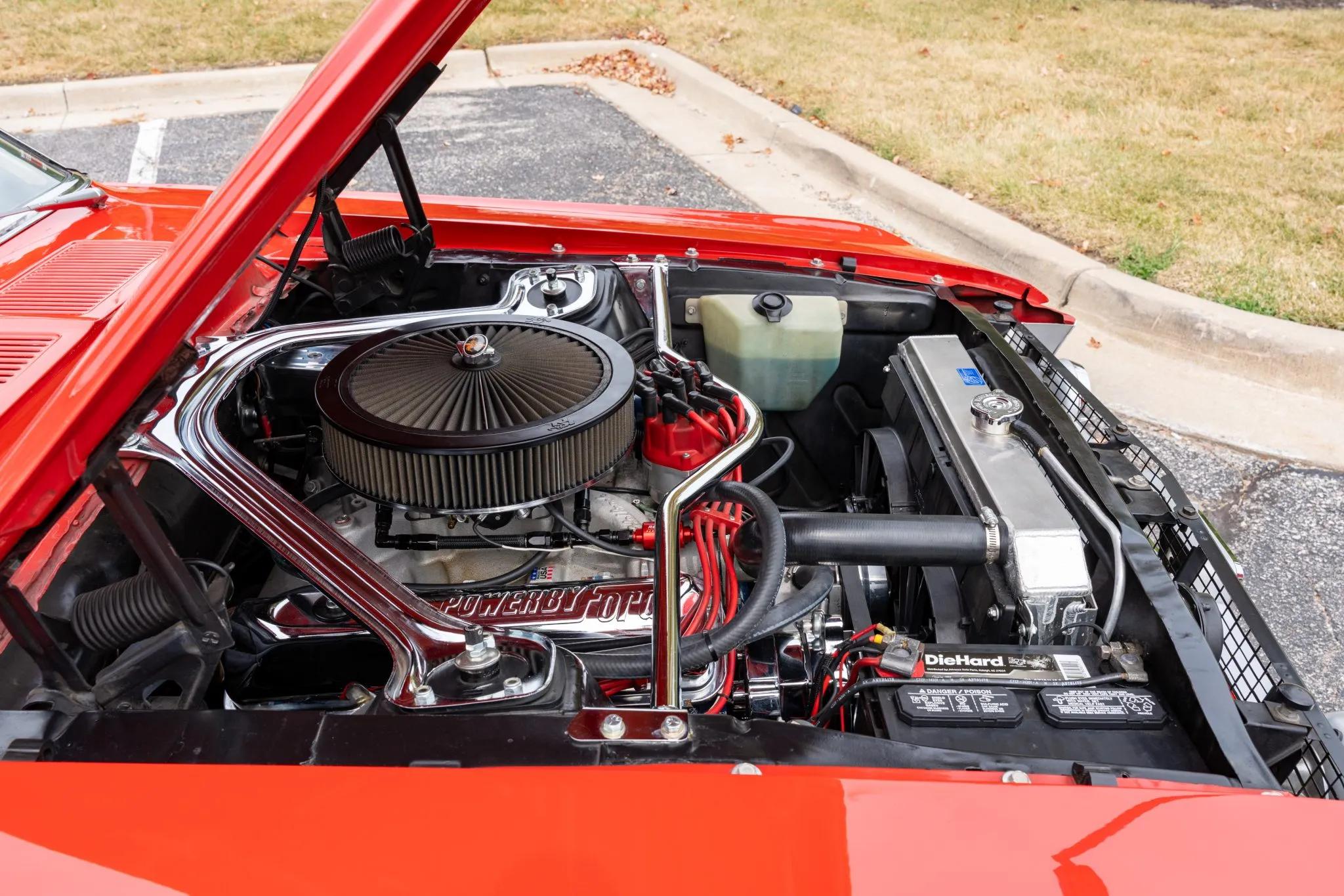 The Mustang rides on Ridetech adjustable dampers and 17" American Racing wheels with staggered tires, and stopping power comes from Wilwood cross-drilled and slotted disc brakes. Additional upgrades include electric power steering, tubular front control arms, coilovers, MagnaFlow exhaust, an aluminum radiator, and a tilt column.