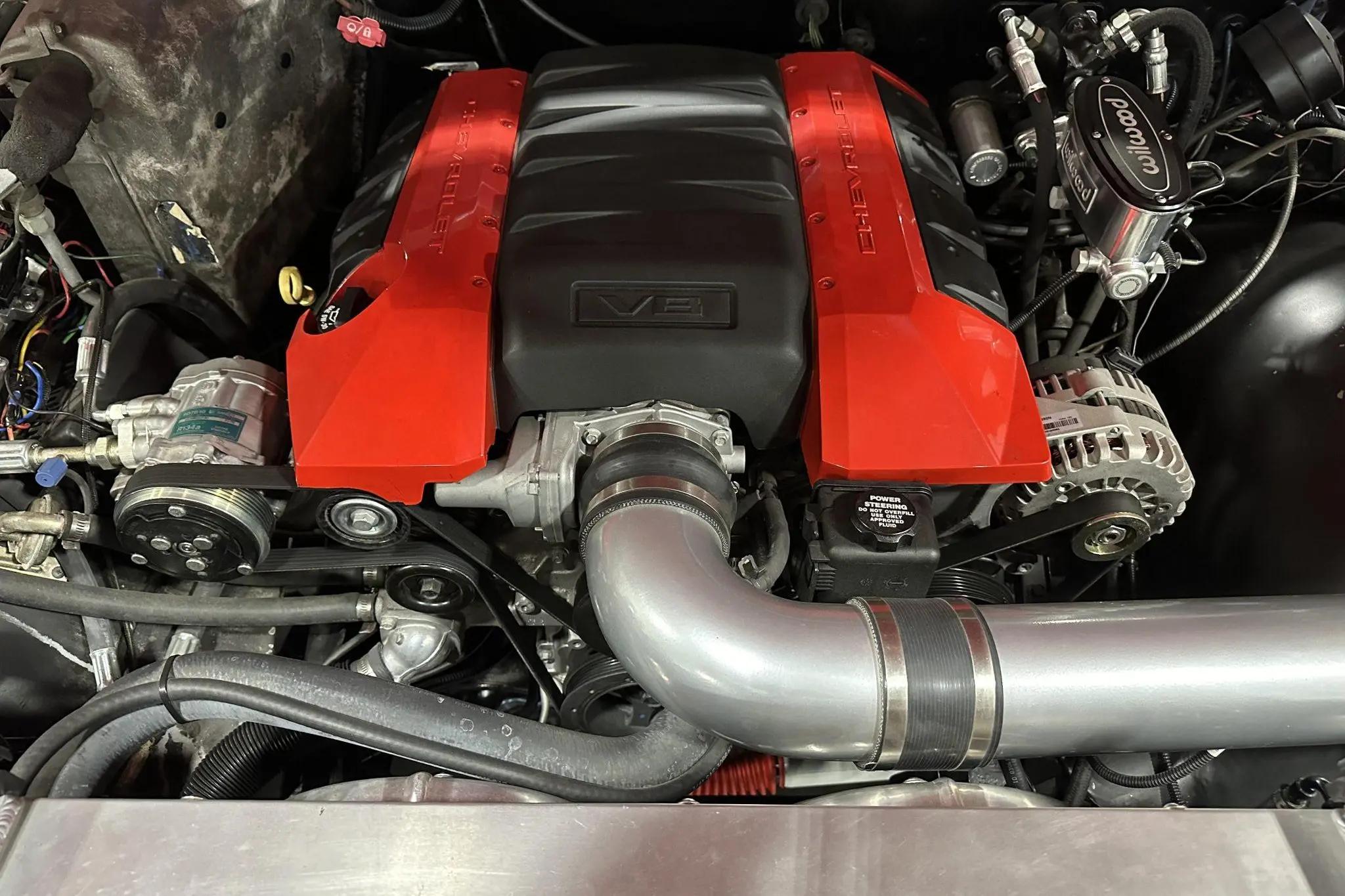 Other upgrades include manually locking front hubs, a custom dual-exhaust system with Flowmaster mufflers, aluminum radiator with electric fans, upgraded camshafts, a serpentine belt drive kit, and chrome bumpers. The aftermarket three-spoke steering wheel frames a 100-mph speedometer, tachometer, and auxiliary gauges. The five-digit odometer reads 2,700 miles, with total mileage unknown.