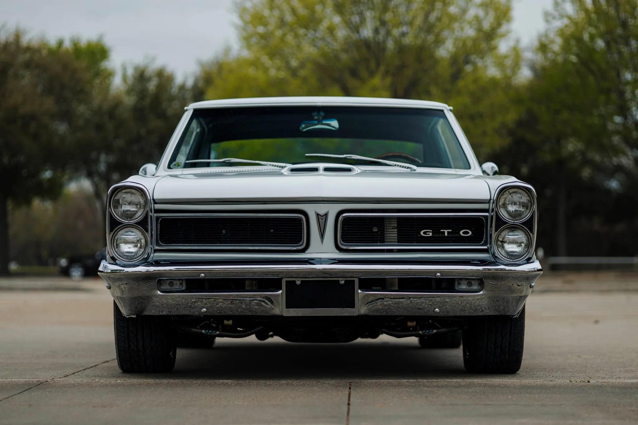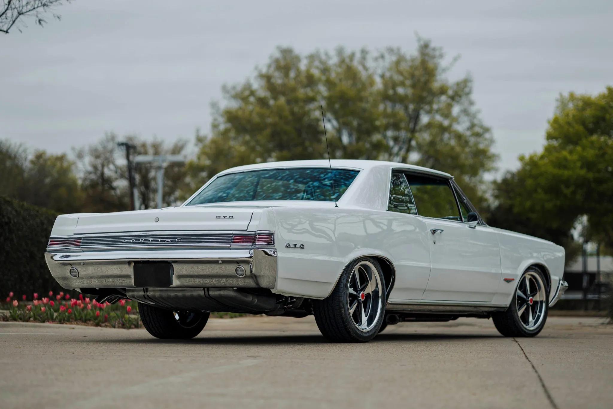 This 1965 Pontiac LeMans hardtop coupe is finished in white over black vinyl and was modified under previous ownership with a 5.7-liter LS1 V8 paired with a 4L60E four-speed automatic transmission. The car rides on a Classic Performance Products four-link rear suspension, adjustable Viking coilovers, and tubular front control arms, and is equipped with power steering and power-assisted front disc brakes.