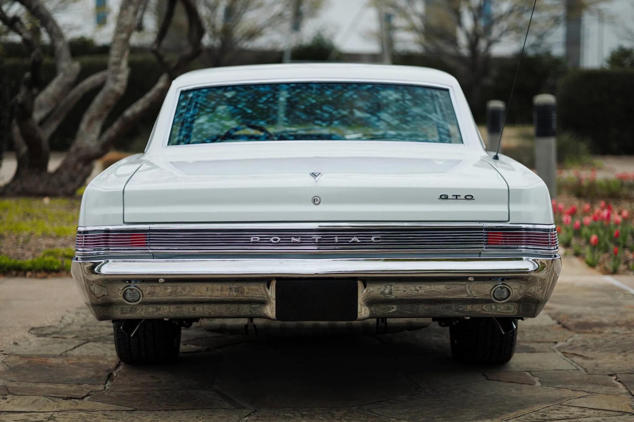Exterior features include a hood scoop, stacked headlights, GTO badging, dual mirrors, chrome bumpers, polished rocker moldings, and a dual-exit exhaust with electric cut-outs. Aluminum 18" Year One Rally-style wheels are fitted with 235/45 front and 255/45 rear LingLong Crosswind tires.
