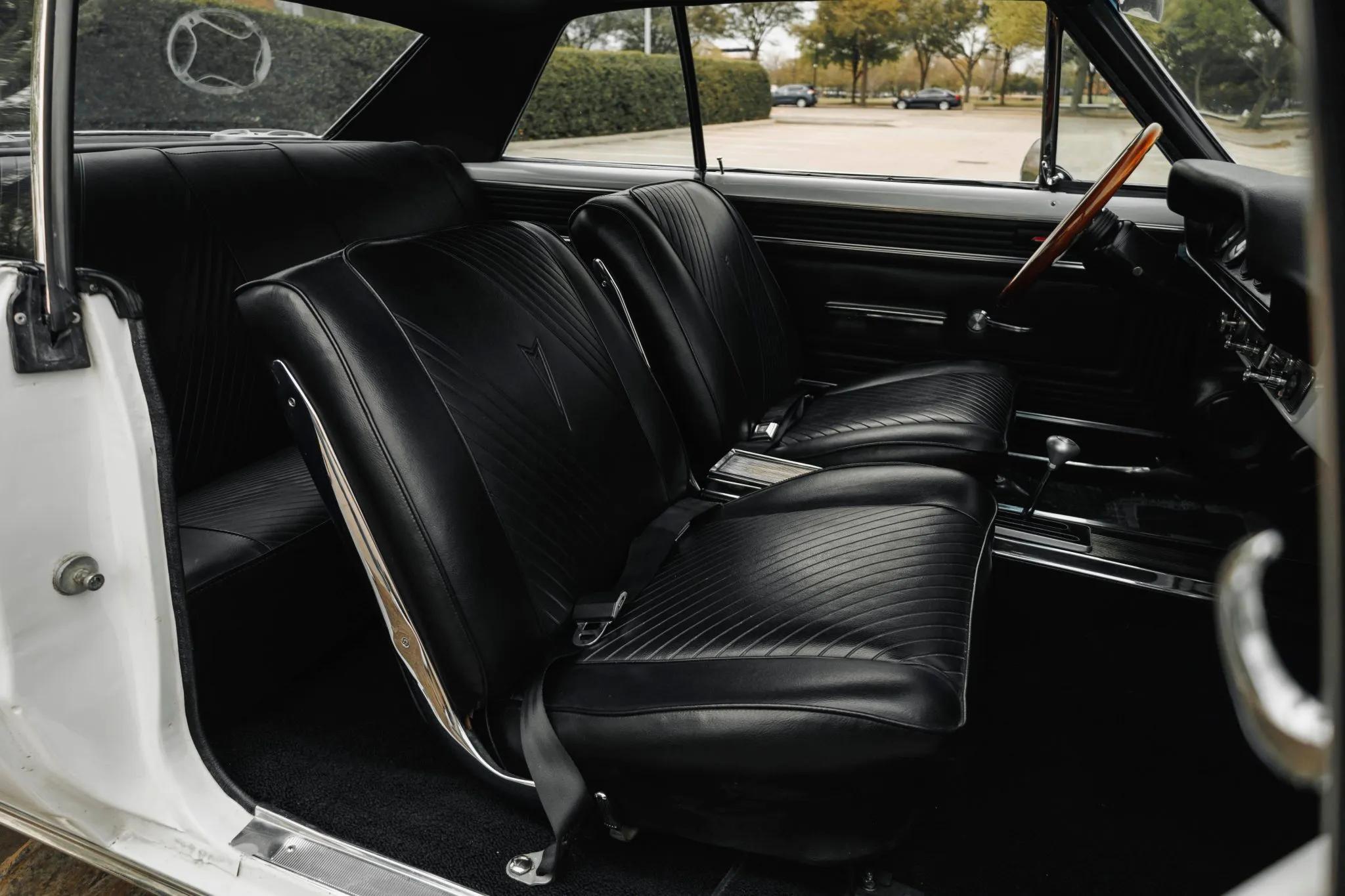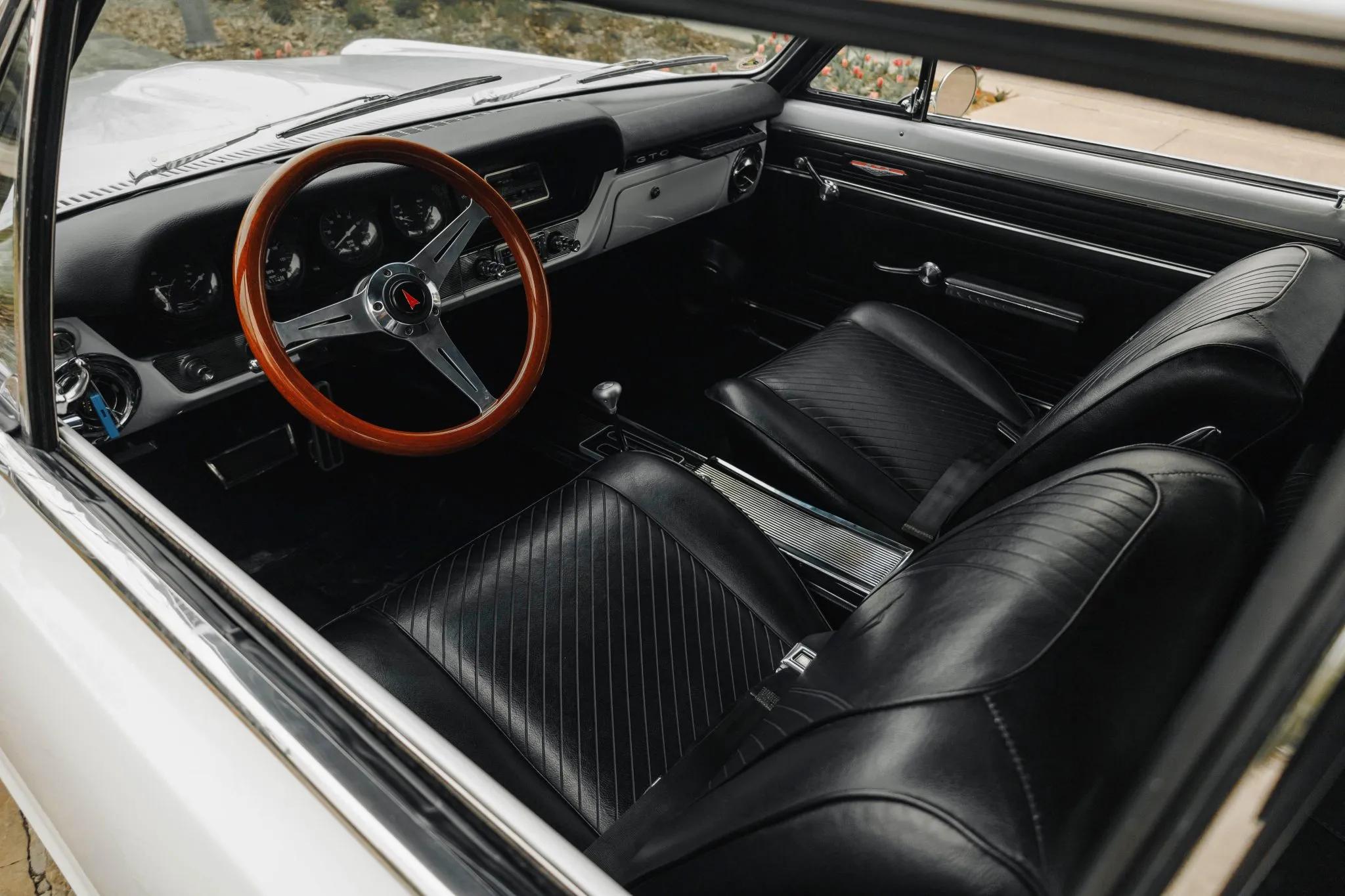 Inside, the cabin has front bucket seats and a rear bench trimmed in black vinyl with Pontiac center logos. Appointments include Vintage Air climate control, a wood-rimmed billet steering wheel, Classic Instruments gauges, a Lokar shifter, engine-turned trim, lap belts, and a retro-style digital stereo with Bluetooth. A battery cut-off switch is mounted in the trunk.