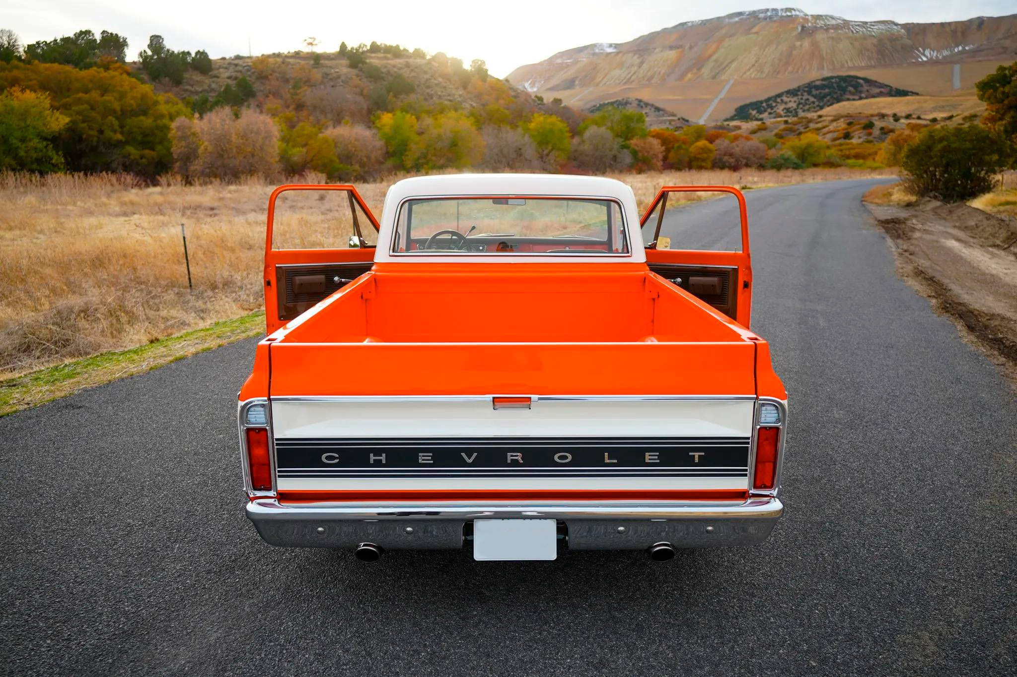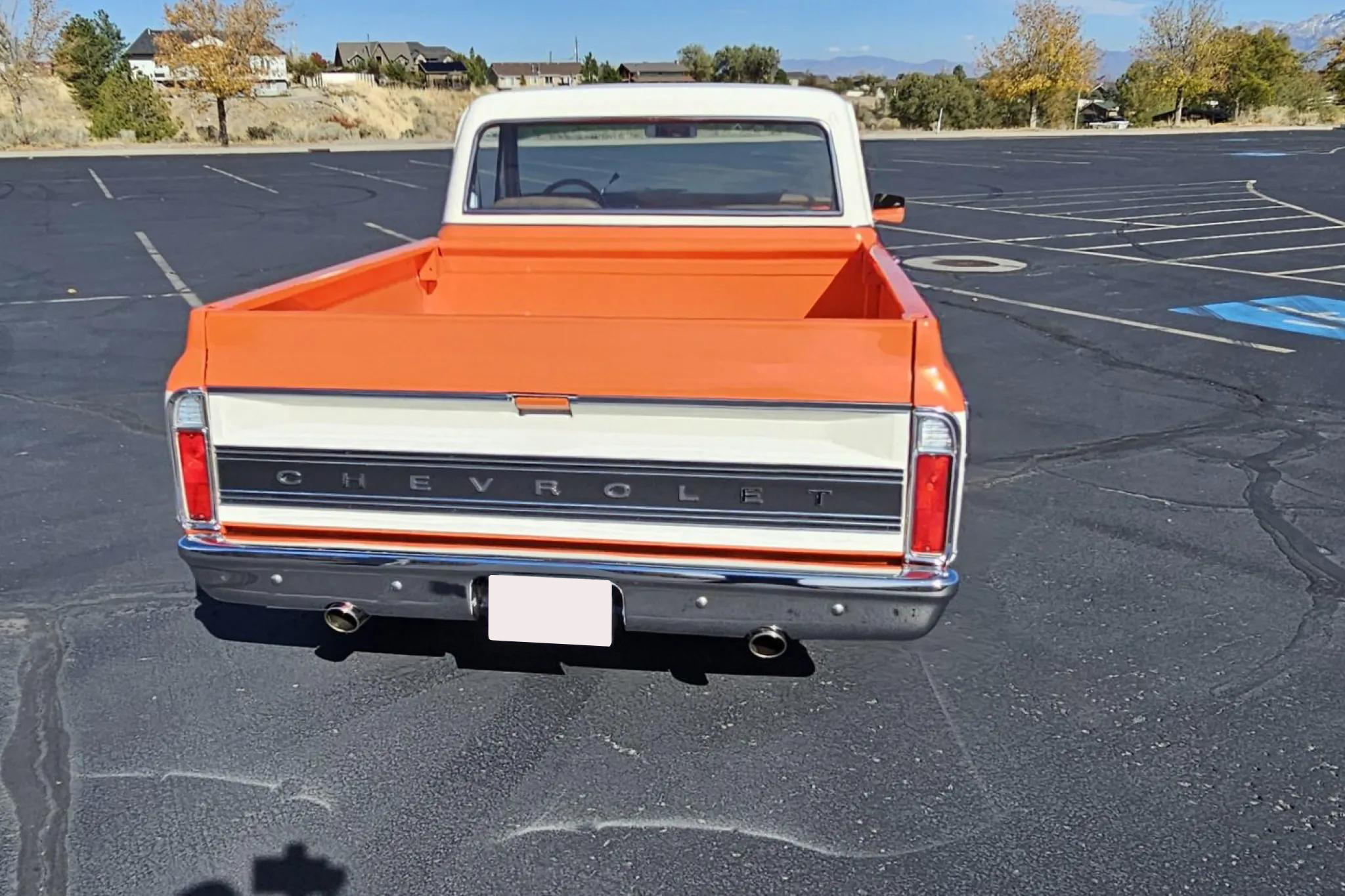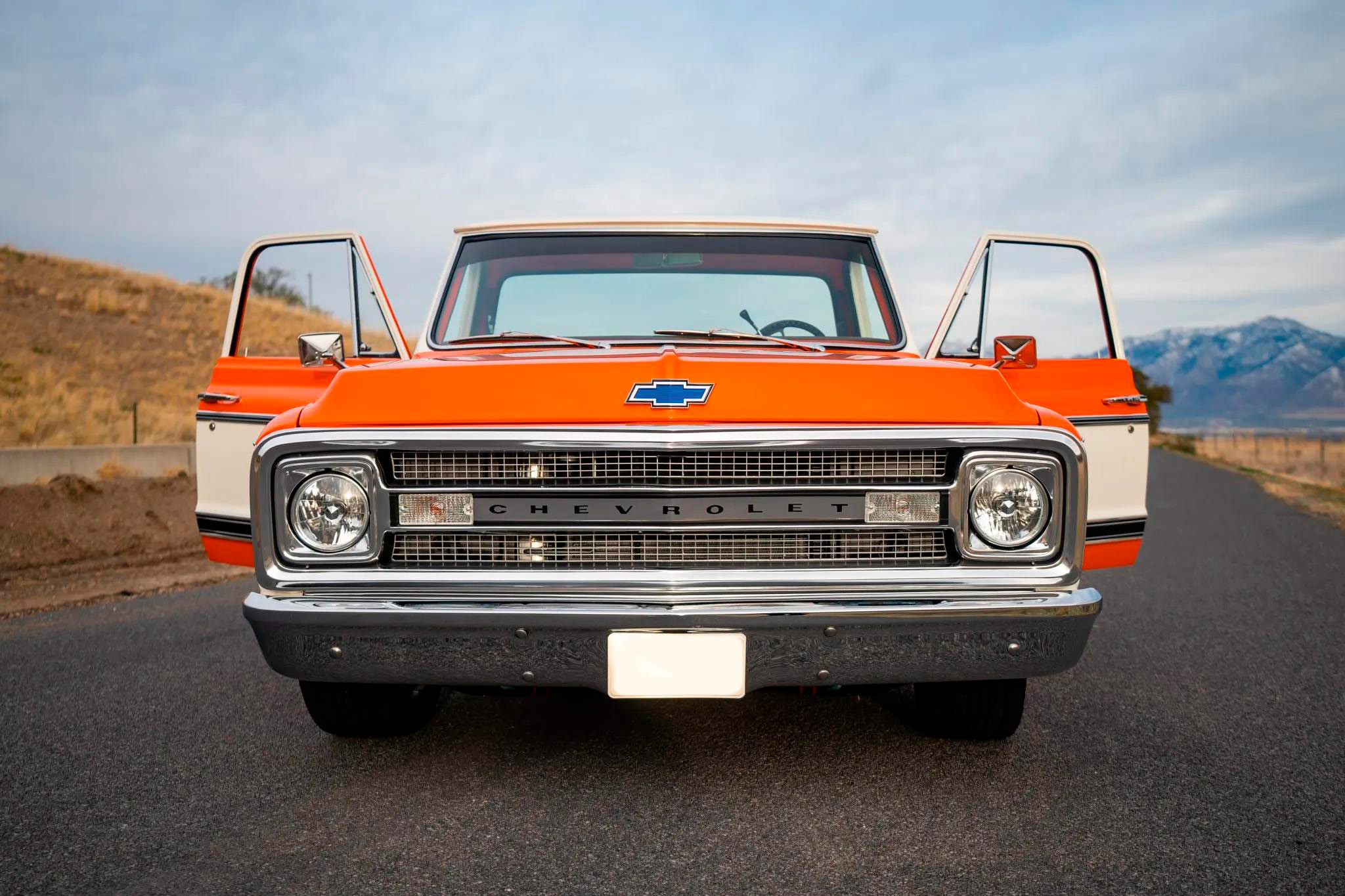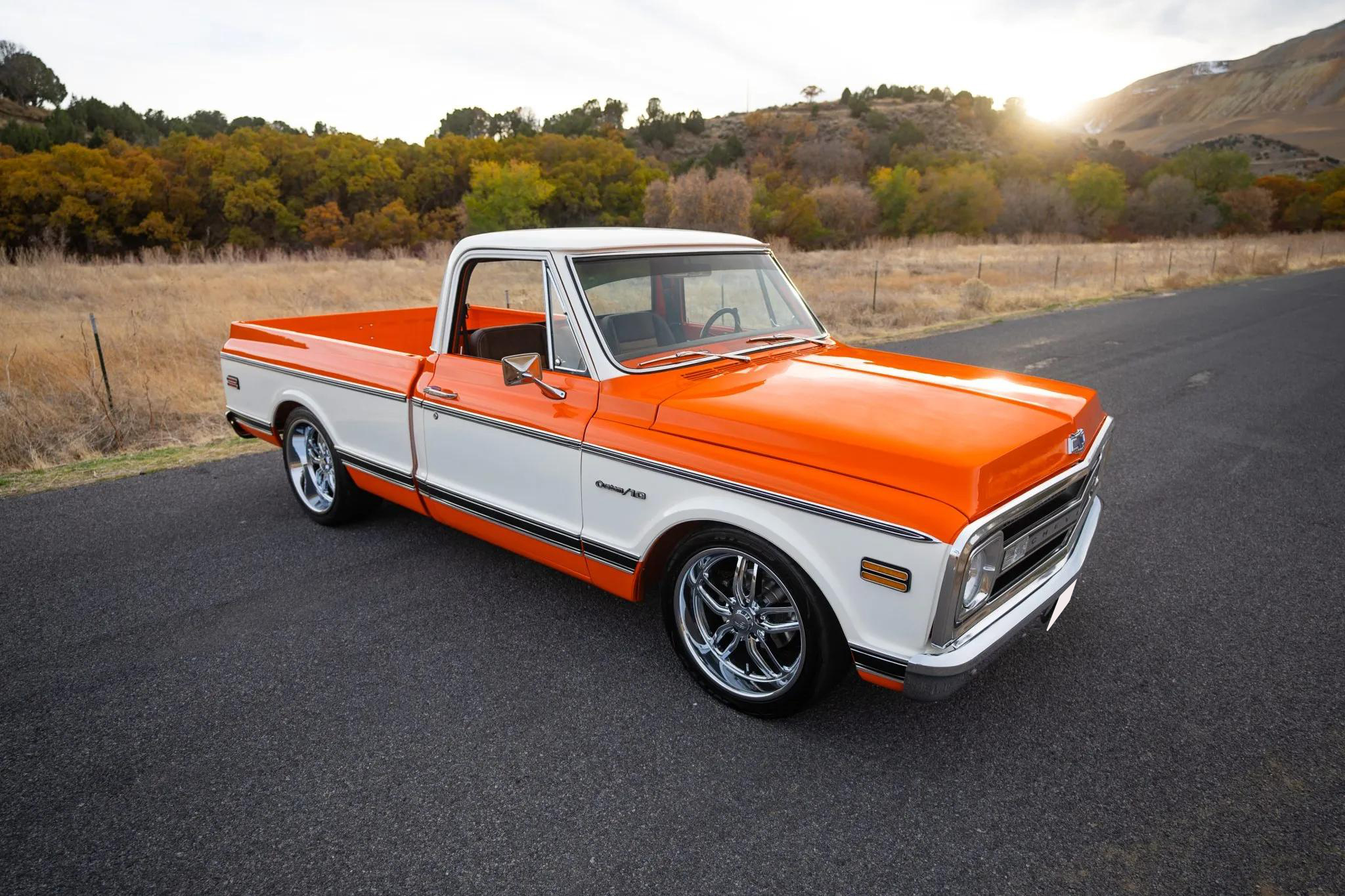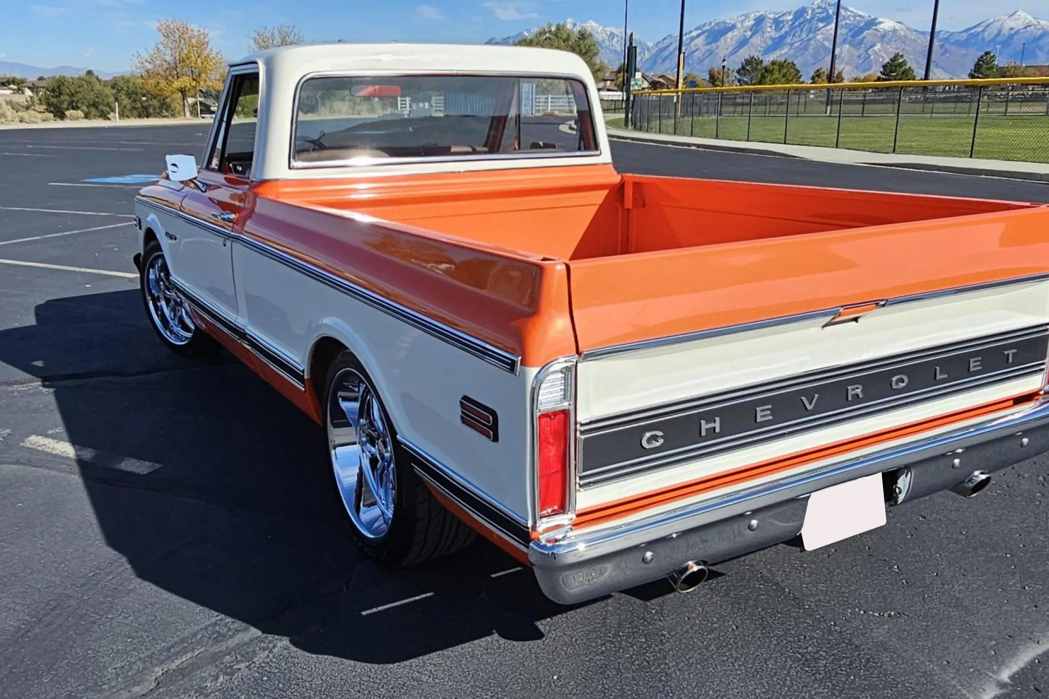 This 1970 Chevrolet C10 pickup was acquired by the seller in 2023 as a stalled project and subsequently modified by J Custom Fab in South Salt Lake, Utah. The truck was refinished in Orange Blast Pearl and Vanilla Milkshake and fitted with a 5.7-liter LS6 V8 paired with a 4L65E four-speed automatic transmission. Engine upgrades include hypereutectic pistons, a TSP Magic Stick 3 camshaft, forged H-beam connecting rods, and a FiTech Ultimate LS standalone ECU. Power is delivered to a 12-bolt rear end with 4.11:1 gears and chromoly axles, and the dual exhaust system features an H-pipe.